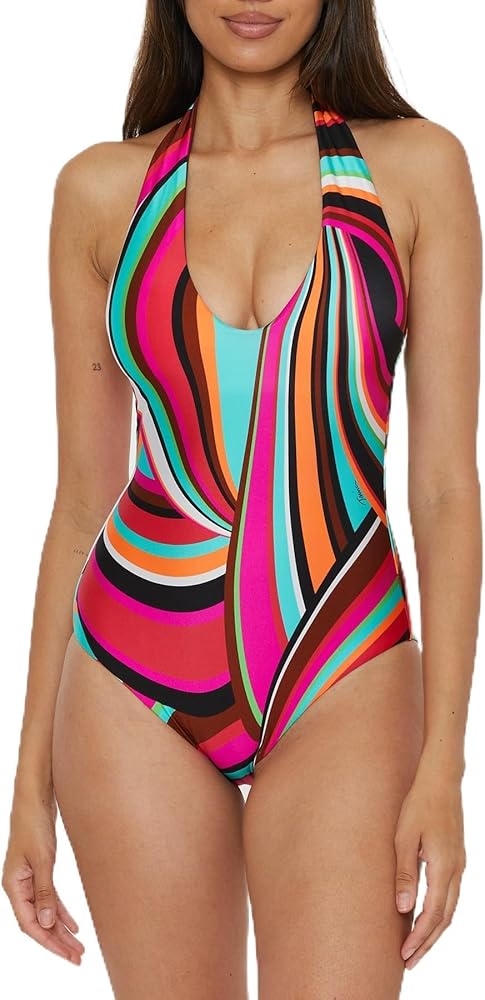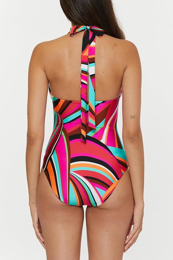 The Trina Turk Swoop Women's One Piece Swimsuit is the epitome of poolside chic. With its halter neck and plunging neckline, this swimsuit enhances your natural curves while providing a secure fit. The eye-catching geometric print adds a playful element to your swimwear, and the reversible design to solid pink offers versatility. Whether you're diving into the waves or lounging by the pool, this swimsuit combines comfort, style, and functionality for a standout beach look.