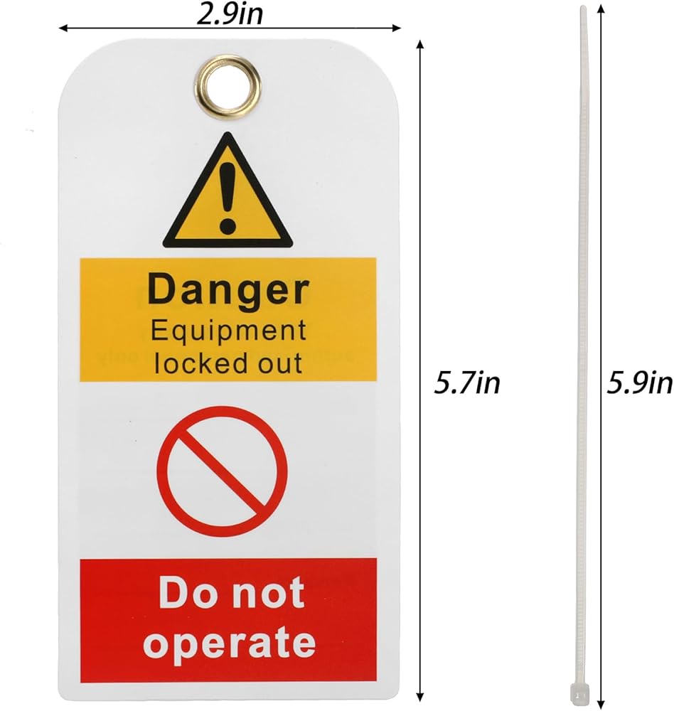 شملت الحزمة 50 حزمة PVC Lockout Tagout العلامات و 50 حزمة 6 بوصة نايلون الرمز البريدي. حجم كل العلامات هو 5-3/4 × 3 في ، قطر ثقب النحاس 3/8 بوصة ، حجم الروابط الرمز البري