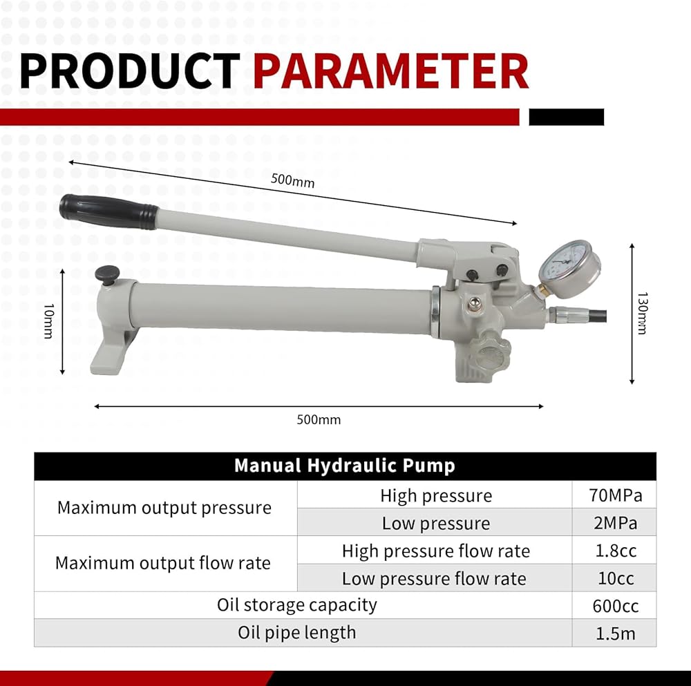 1) Specification: The basic specifications of this manual hydraulic pump are as follows: high pressure 70MPa, low pressure 2MPa, high pressure flow 1.8cc, low pressure flow 10cc, oil storage capacity 600cc. It uses ordinary NPT 1/4 inch fittings and is equipped with a 1.5-meter hose