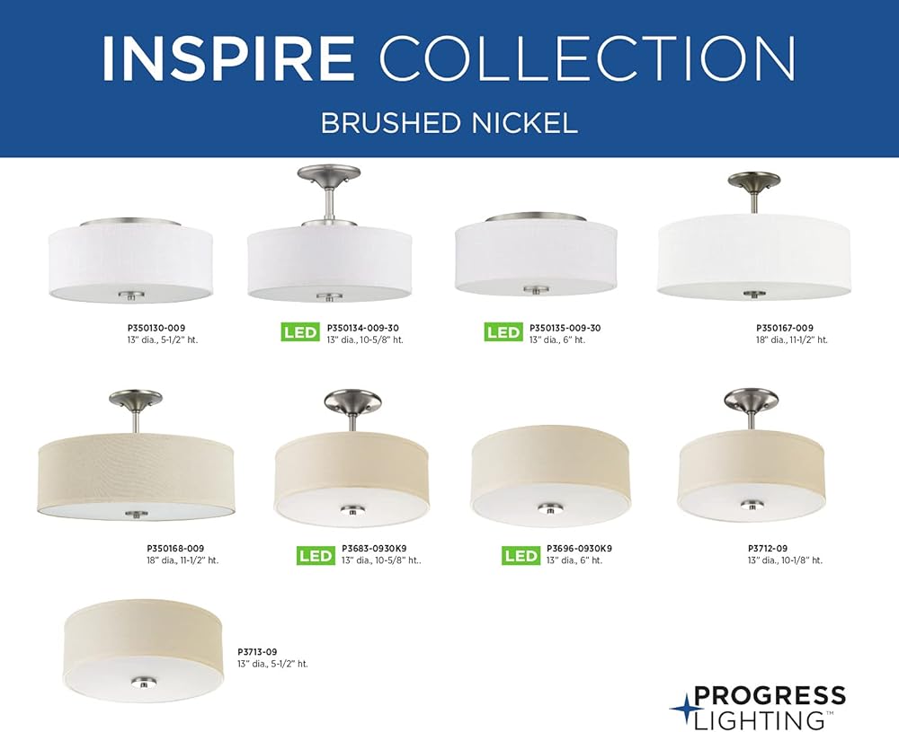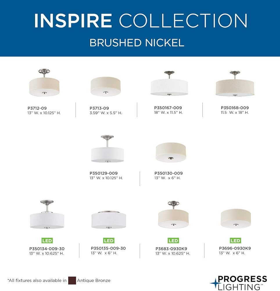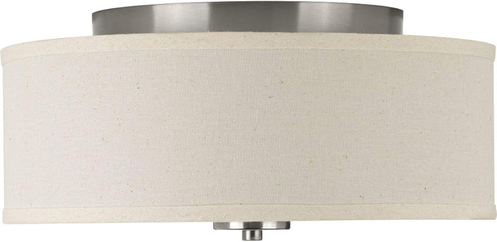 Experience the enduring sensibility of the Inspire Collection's Two-Light Flush Mount. An off-white linen shade with an etched glass diffuser creates a gentle muted glow wherever overhead illumination is needed. The shade is adorned with an antique bronze metal knob for a pinch of modern style. For ideal illumination, the flush mount uses two medium base bulbs that are sold separately (60w max – LED, CFL, halogen, or incandescent). With the ability to be fully dimmable with dimmable bulbs and the approval to be installed in damp locations, the light fixture offers endless versatility when it comes to finding a place in your home décor vision. This ceiling light is ideal for any hallway, foyer, bedroom, bathroom, or wherever overhead illumination is needed in transitional settings. It's time to breathe new life into the mundane every day with timeless and truly transformative lighting. Make your purchase today to begin your journey to a whole new lighting experience. Progress Lighting products are designed for exceptional quality, reliability, and functionality.