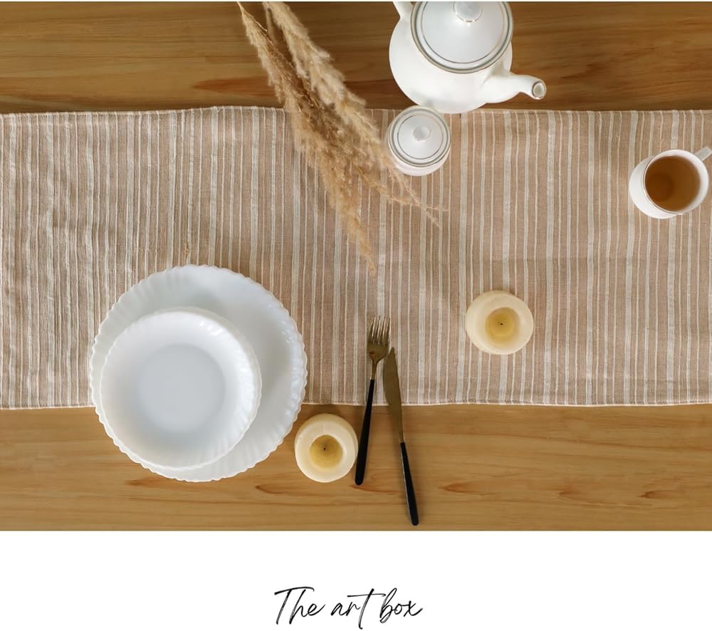 THE ART BOX's sturdy table runners will round off your table arrangement. With tassel edges, each of these beautifully woven table runners, which are made entirely of cotton, features a unique pattern. Enhances the texture of any dining table with its minimalistic yet stylish design. Any tablecloth and napkin set that complements your unique home style can be layered on top.