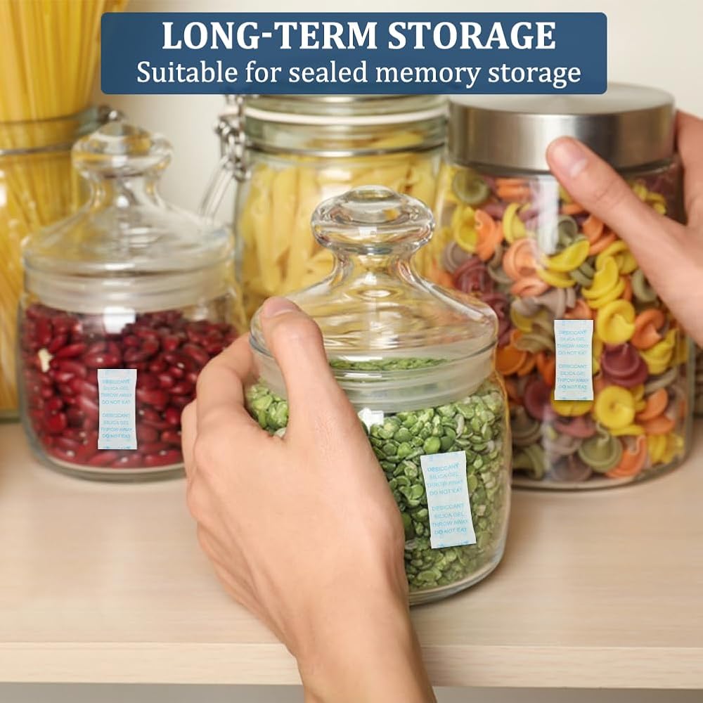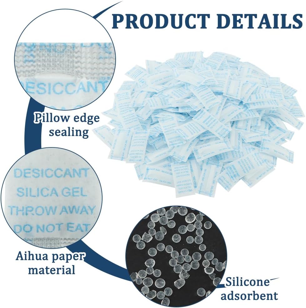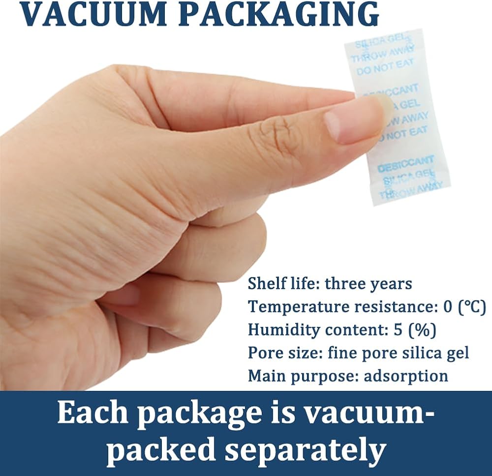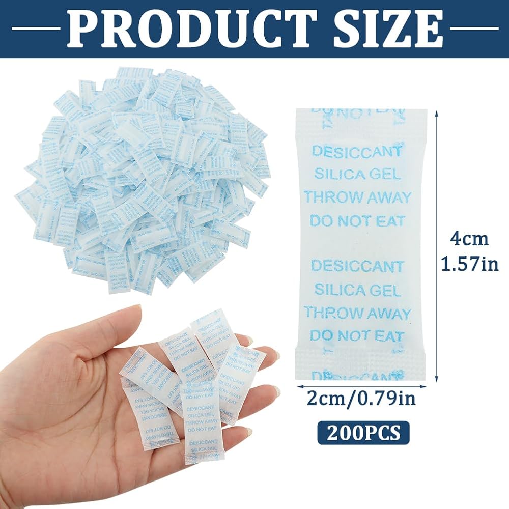 【USED FOR DEHUMIDIFYING】With a total of 200 packs, these silica packets offer convenience and flexibility for various storage needs. Each packet is self-sealed, strong and tear resistant.When the silica gel inside becomes cloudy, indicating that it has saturated with water, and you can throw it away.Prohibit the consumption, please keep it away from the Kids and Animals.