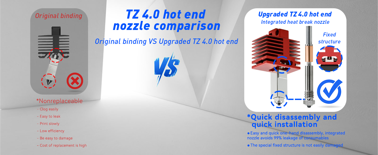 ترقيات هيكل الفوهة ، واستخدام كتلة التدفئة الخيوط والحنجرة ، لحل ظاهرة السقوط ، ويمكن تفكيكها واستبدالها ، مما يقلل من تكلفة الاستخدام