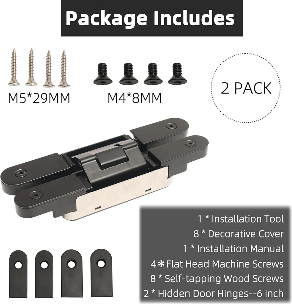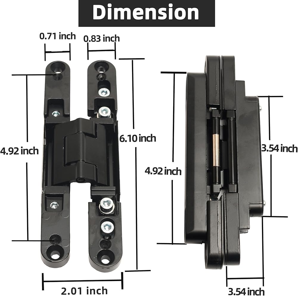▶ الأبعاد --- يقيس كل مفصلات غير مرئية 6.10 "× 2" × 1 "بوصة ، مزودة ببراغي التنصت الذاتي: M5*29mm ؛ مسامير الرأس المسطحة: M4x8mm. تناسب الأبواب الخشبية والأبواب المتدفقة.