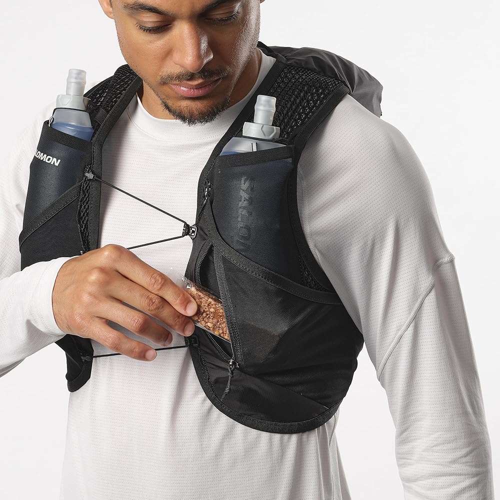 CONVENIENT STORAGE: Optimized storage room and plenty of pockets to securely carry nutrition, gels, and essentials within easy reach. 1 back compartment, 1 zippered compartment, an internal pocket, and 2 front stretch pockets. Compatible with Salomon Custom Quiver to carry your poles (not included).