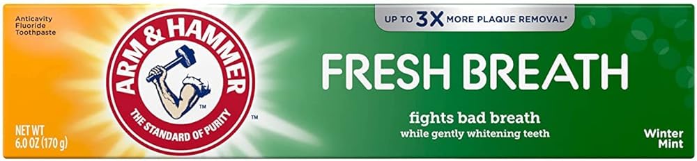 Arm & Hammer Advance White Breath Freshening Toothpaste works to give you cleaner teeth and a whiter smile – safely, gently, and effectively. The fluoride cavity protection and enamel strengthening formula remove more plaque in hard-to-reach places – up to 5 times more plaque than a non-baking soda toothpaste! You get a deep clean that penetrates in between teeth and along the gum line to remove plaque and stains. It also includes a tartar control agent that helps keep tartar from forming. This advanced formula keeps your teeth protected and prevents new stains from setting. It's a low abrasion formula, so the enamel won't be damaged. All that combined with the gentle power of Arm & Hammer Baking Soda to safely whiten gives you something to smile about. The baking soda also neutralizes acids that weaken and erode enamel and helps protect teeth from the impact of dietary sugars. All that plus the Winter Mint flavor leaves your mouth with a fresh from the dentist feeling of clean! Includes one 6 oz. tube of Arm & Hammer Advance White Breath Freshening Toothpaste. For stronger, healthier teeth and gums, choose Arm & Hammer Baking Soda toothpaste. Versatile and affordable. Gentle yet powerful. For generations of families, Arm & Hammer Baking Soda has been the standard of purity, and a trusted household staple in millions of cabinets and pantries. Our toothpaste and many of our personal care products are made with Arm & Hammer Baking Soda, delivering the quality you can count on, from the brand you trust. *when used as part of a complete brushing routine.