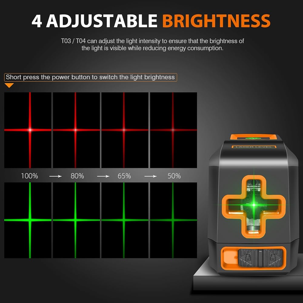 High Visibility with Adjustable Laser Line: The cross line laser level projects a bright, precise laser line with an accuracy of ±3mm at 10 meters. It features four adjustable brightness settings, making this line laser level ideal for different lighting conditions, ensuring you can always level with laser precision indoors or outdoors.