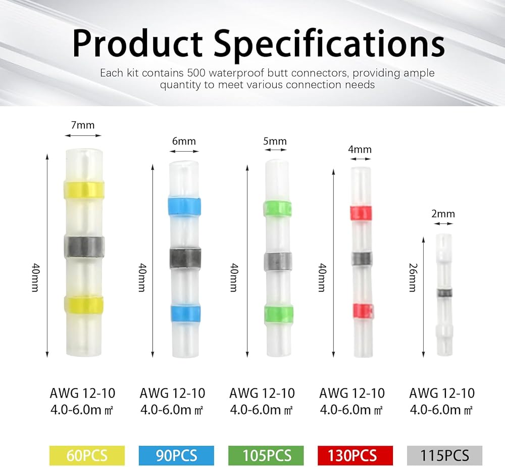 Large Capacity Kit: Each kit contains 500 waterproof butt connectors, providing ample quantity to meet various connection needs