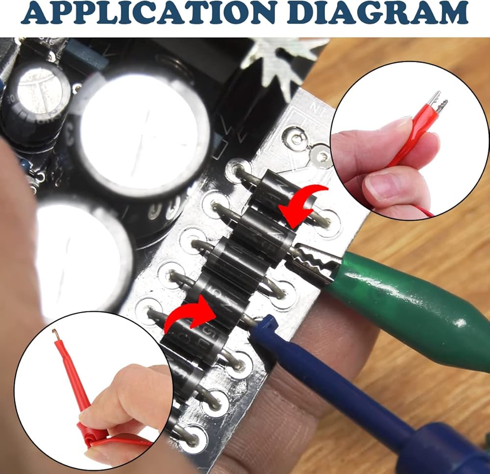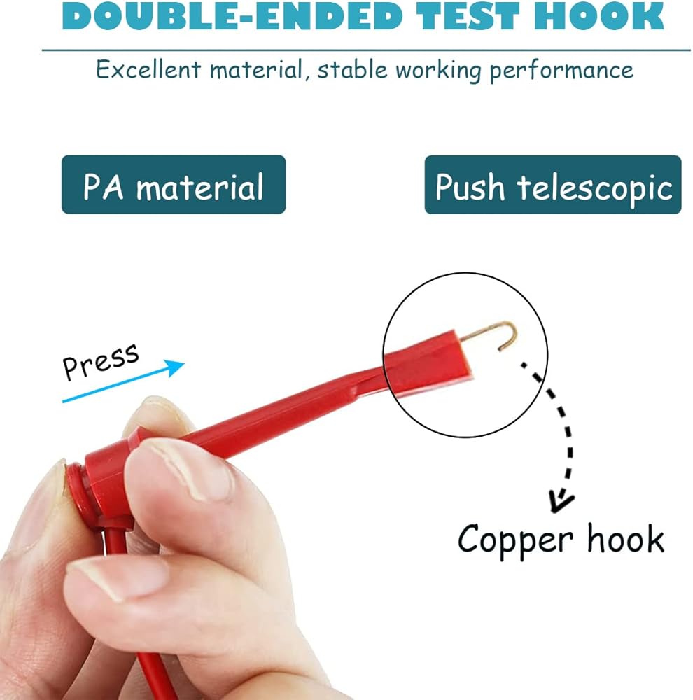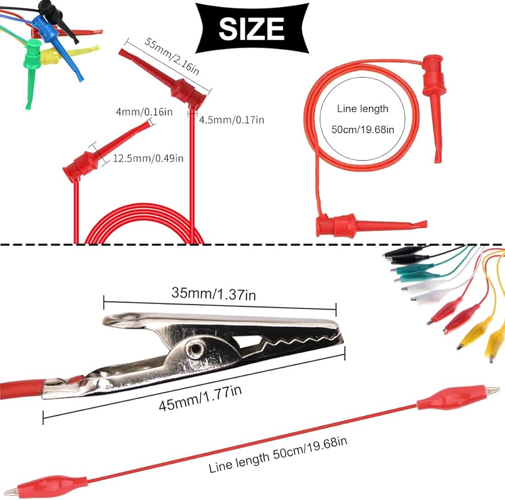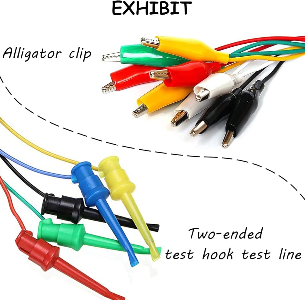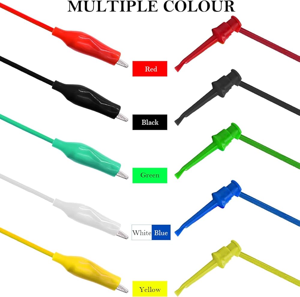 • Package includes: 5 test hook clip leads and 5 alligator clip test leads. A variety of colors, easy to distinguish during use. The yellow, white, black, red and green leads allow you to distinguish different circuits when testing different channels.