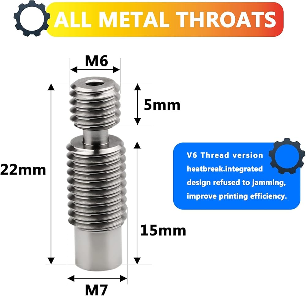 High temperature: The V6 titanium alloy insulated throat has good thermal conductivity, providing excellent thermal isolation between the heater and cooling block, ensuring the stability of the 3D printer