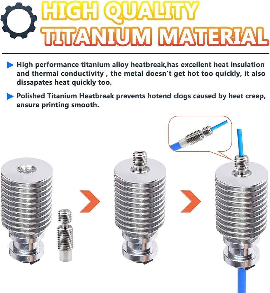 Material: V6 titanium heat shield is made of titanium alloy with good thermal conductivity and insulation. The titanium throat prevents hot end blockage caused by thermal creep and ensures smooth printing