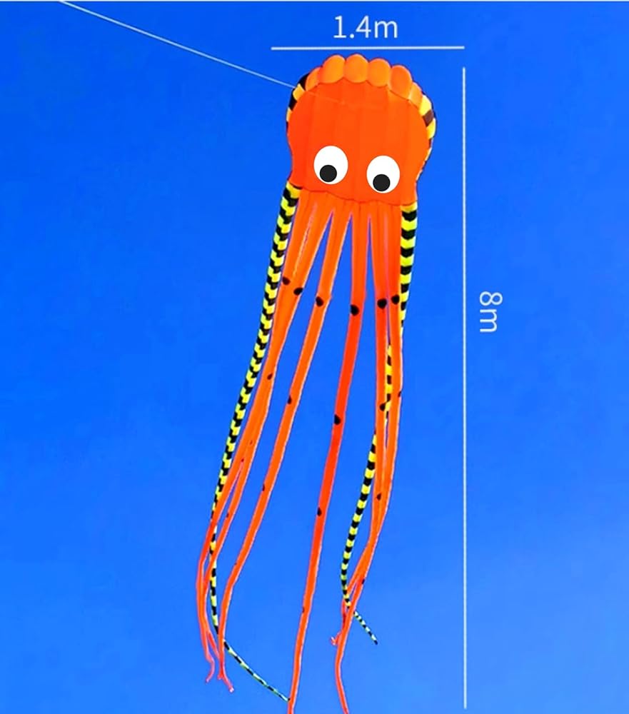🔥26 Feet (8 Meters ) 3-D giant octopus foil kite will look stunning in the sky at any time of the year, it will delight flyers of all ages. With its bright and vibrant colors. it is a colorful wonder in the sky and let it looks like Alien in the sky. 🔥The Benefits of Kite Flying: Kite flying has more benefits than most of us think of: 1️⃣ Kite flying will regenerate energy and has a way of reducing stress and tension of everyday life. 2️⃣ Kite flying develops creative thinking, both in the making of the kite as well as flying and adapting it. 3️⃣ Another less known benefit of kite flying is the development of concentration. 4️⃣ Kite flying is one of the only recreational activities that is both low budget as well as safe and environmentally friendly. 5️⃣ Kite-flying is also good for eye health. People must look at the blue sky flying kites, kite line of sight distance with the level of the move, better regulation of the regulating eye muscles and nerves, which helps relax your eyes and alleviate fatigue.