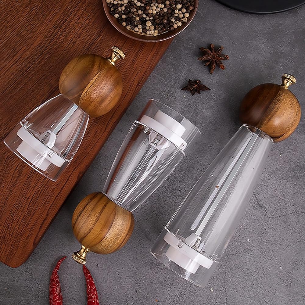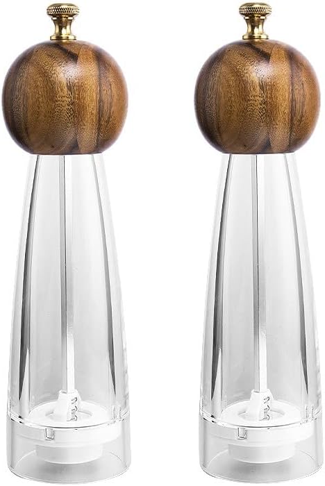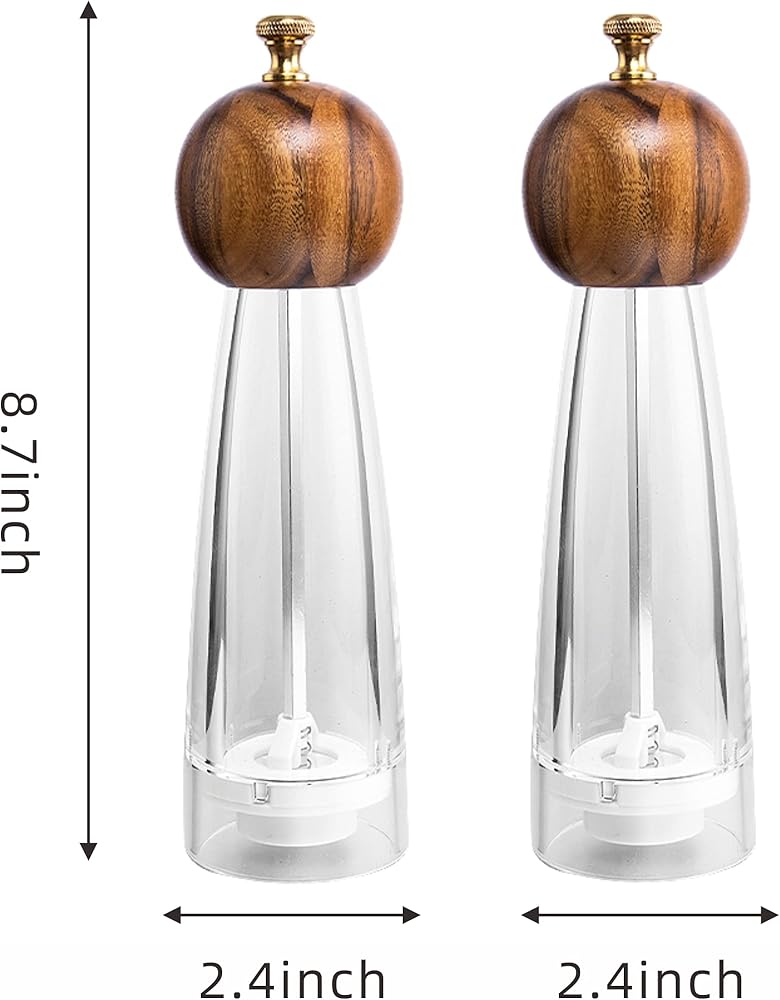 8.7” KOA Wood Salt & Pepper Grinder Set-KOA wood cover with acrylic bottle-The set includes 2x pepper&salt grinders. Bottles sizes: 8.7” (H) * 2.4”(W)