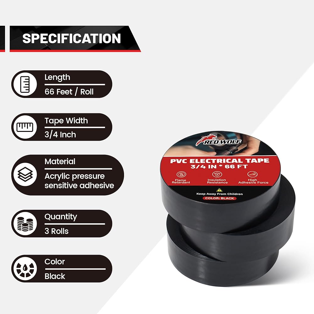 المواصفات: 3/4 "× 66 قدمًا - 3 لفات شريط كهربائي PVC. الحجم: كل شريط تسخير كهربائي أسود يبلغ طوله 66 قدمًا وعرضه 3/4 بوصة ؛ إنه يعمل لتلبية احتياجاتك اليومية المختلفة في سيناريوهات الاستخدام المتنوعة