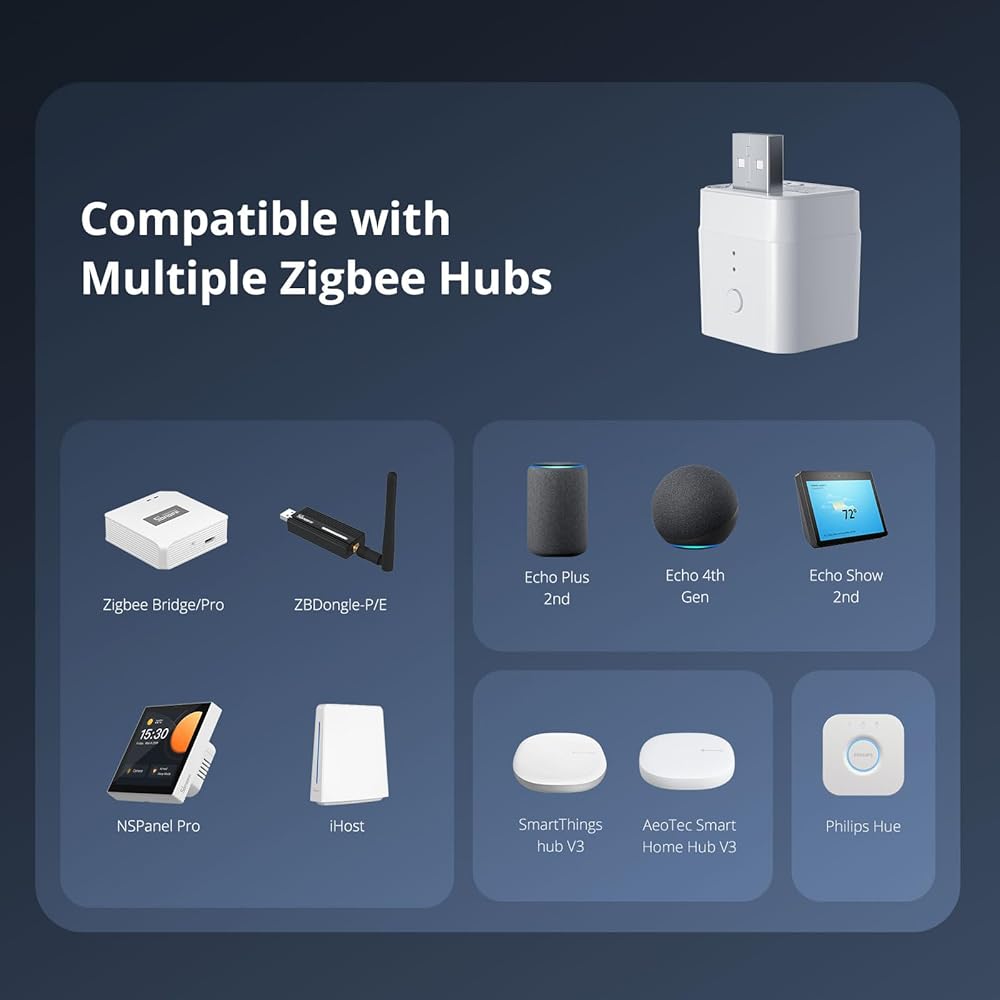 • التواصل المستقر مع أجهزة zigbee: مقارنة بأجهزة WiFi ، توفر أجهزة Zigbee المزيد من التواصل المستقر بعد الاقتران ، وحل المشكلة الشائعة من الأجهزة الذكية WiFi في كثير من الأحيان. بالإضافة إلى ذلك ، يضخّم هذا المكرر إشارات داخل شبكة المنطقة المحلية Zigbee. (ملاحظة: يجب استخدام مفتاح USB هذا مع بوابة zigbee.)
