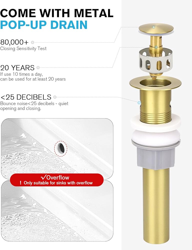 • مع تصريف المنبثقة: تأتي صنابير الحمام الخاصة بنا بمصارف منبثقة للأحواض ذات الفائض والمعايير عن طريق اجتياز اختبار عمر لأكثر من 15000 دورة مفتوحة من الناحية ، فمن السهل إزالتها وتنظيفها.