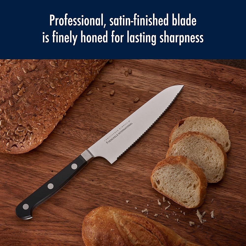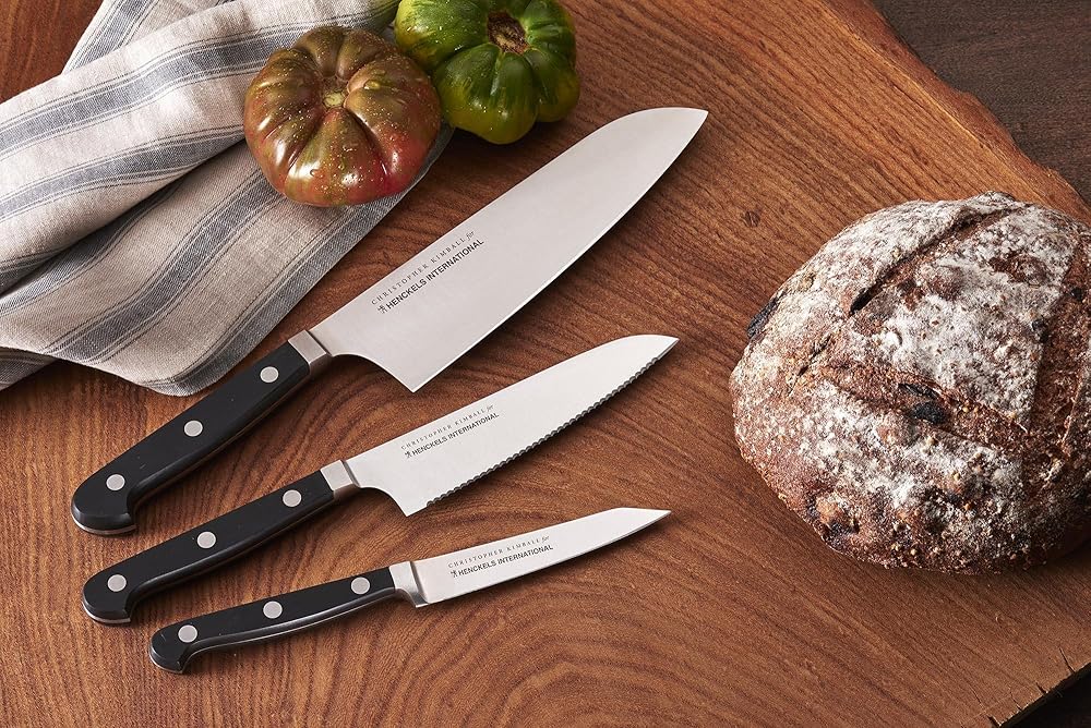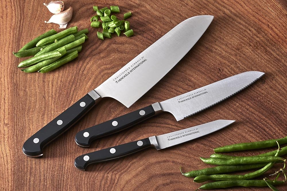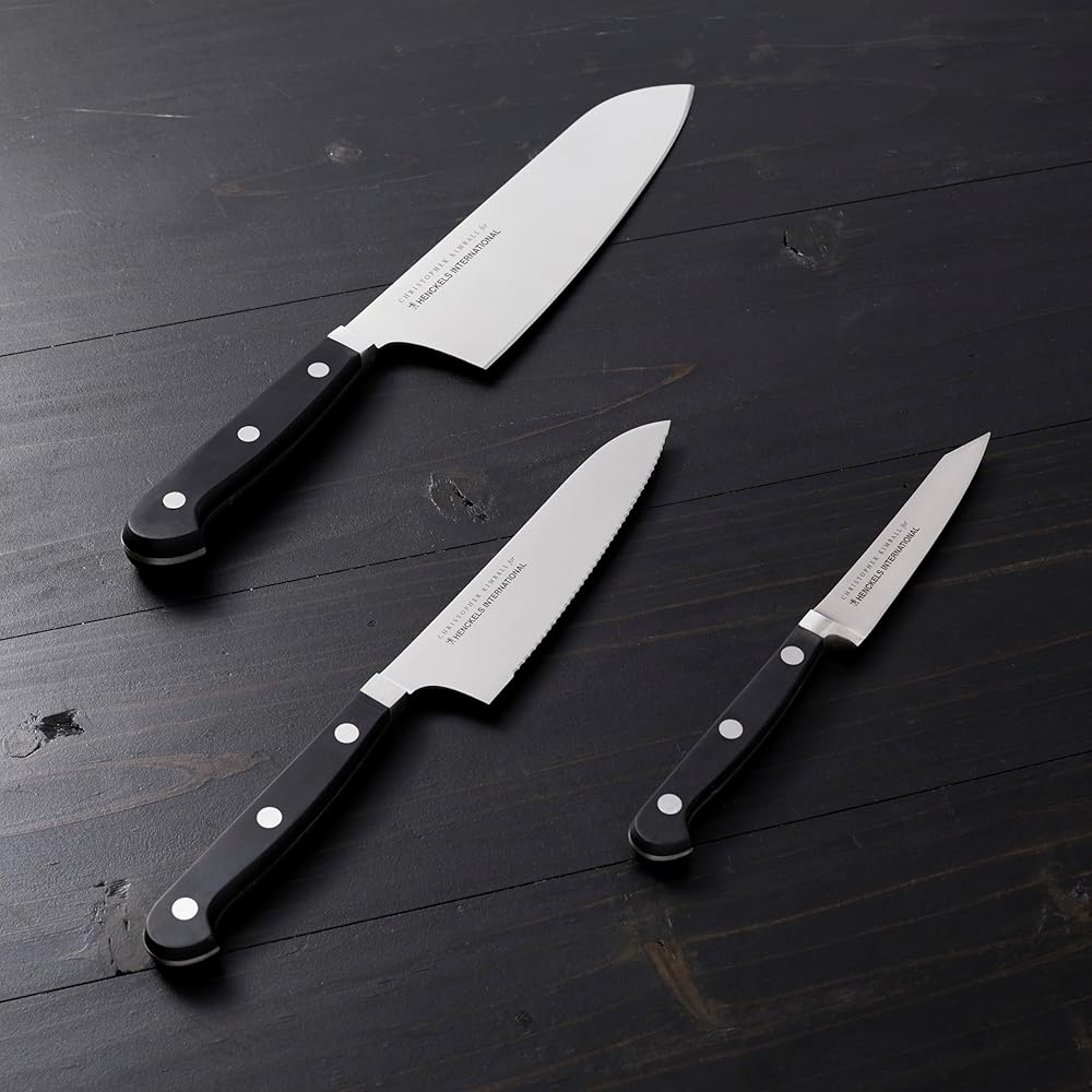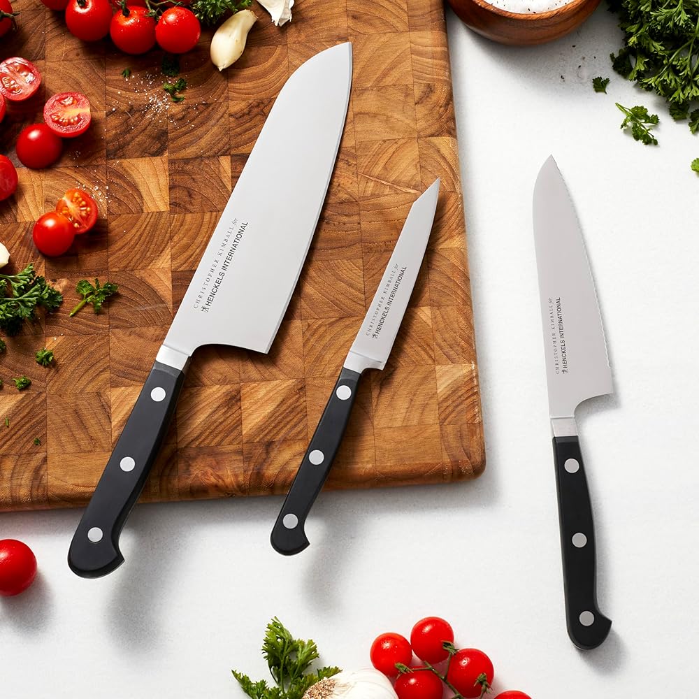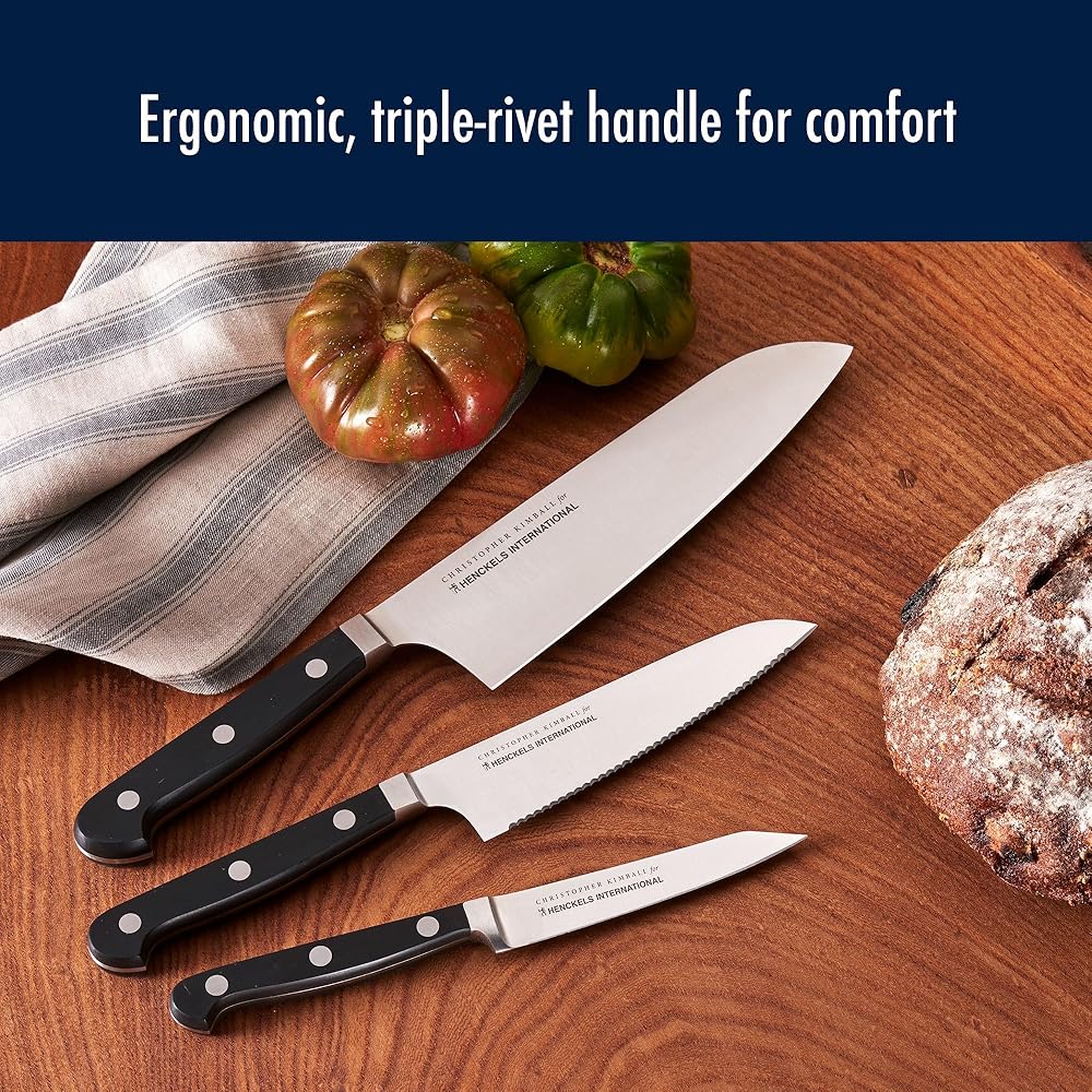 Christopher Kimball has been teaching cooking for three decades on national television and radio, as well as in award-winning cookbooks, magazines, online, and at live events. Founder of Christopher Kimball's Milk Street Kitchen and a friend of the real home cook, Mr. Kimball is fascinated by the tools of the trade including what works and what doesn't. Now he is putting that experience to good use in designing kitchen tools for how we really cook today. Experience confidence with each cut. The Henckels International CLASSIC Christopher Kimball Edition 3-pc Collector's Set boasts precision blades that are designed for long-lasting sharpness. This set includes a 4" paring knife, 5.5" serrated utility knife, and a 7" cook's knife. Everything you need for day-to-day kitchen tasks. With a seamless transition from blade to handle, the knives' fully forged construction provides balance as the traditional triple-rivet handles encourage tireless cutting.