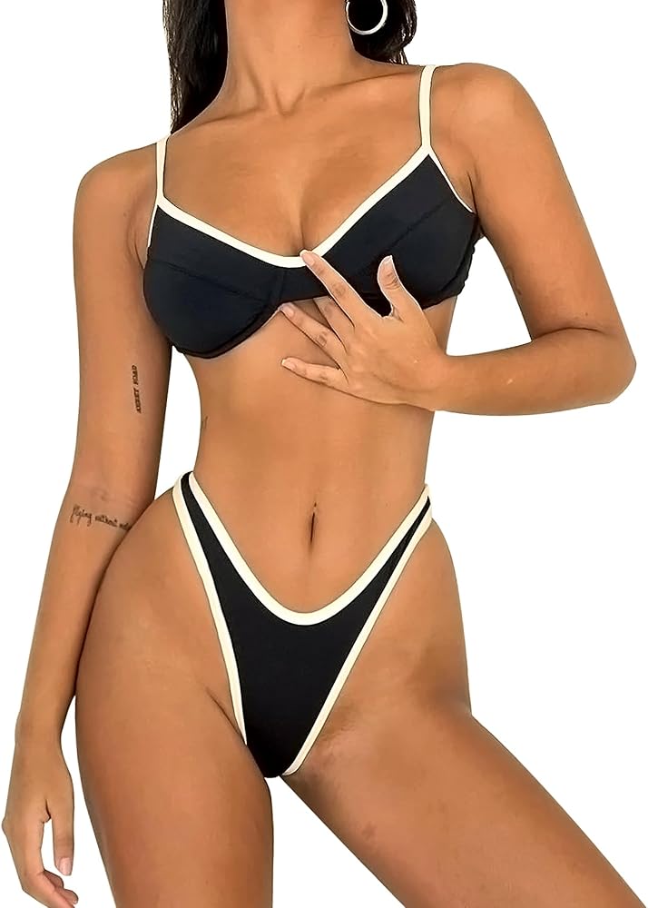 ميزات 2 قطعة لون كتلة السباحة ، مغرفة الرقبة. قابلة للإزالة مبطنة. الأشرطة السباغيتي القابلة للتعديل ، والتصميم السفلي للدعم والدفع لأعلى. البرازيلية عالية قطع القاع. متاح للأسود الأبيض والأزرق