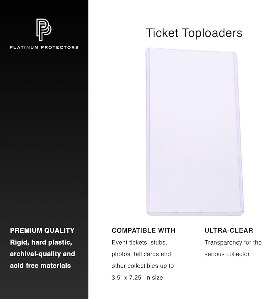 Don't trust your tickets with the "standard" or "regular" quality toploaders that have flooded the market. Platinum Protectors premium quality ticket toploaders are for the serious collector. The perfect way to preserve your event tickets, stubs, photos, tall cards and other collectibles safe and secure. Made of durable premium hard plastic. Ultra-clear transparency with no imperfections.