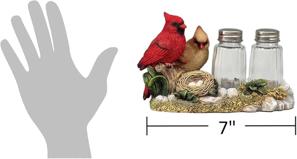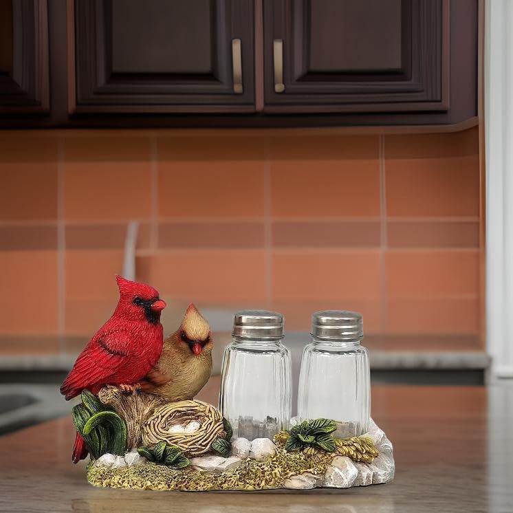 Bring a touch of nature to your kitchen with this Decorative Cardinal Salt and Pepper Shaker Set by The Bridge Collection. Featuring a beautifully crafted pair of cardinals perched on a nest, this set combines function with rustic appeal, perfect for adding a woodland feel to your kitchen decor. Measuring 7.13" x 3.13" x 4.38", it's ideal for any nature-themed home.