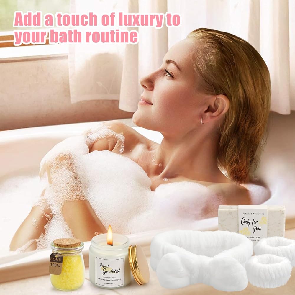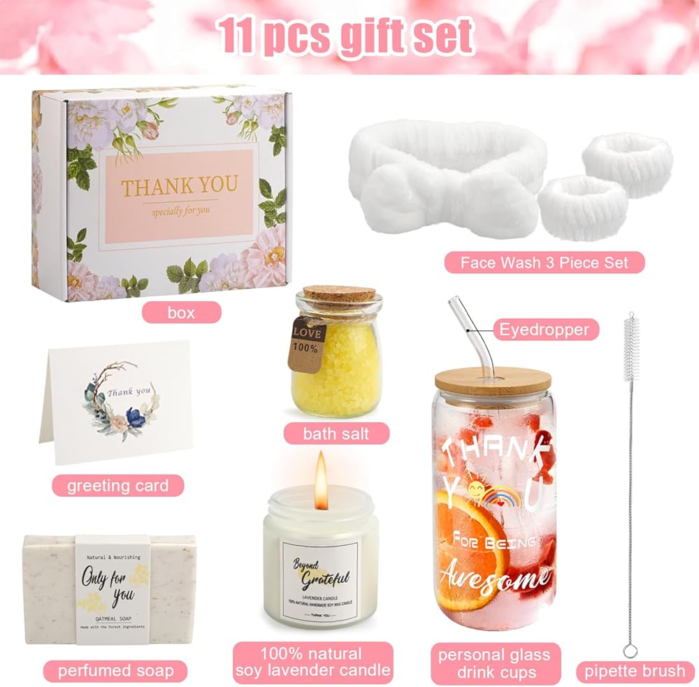 سلة هدايا أخت عملية من الأخوات: داخل صندوق التغليف المصمم جيدًا ، ستجد: أكثر كأس زجاجي 1*"شكرًا لك على كونك رائع" مع أغطية وقش ، 1*"شمعة ممتنة ، 1*البحر الفاخر الأملاح ، 1*"فقط من أجلك" الصابون المصنوع يدويًا ، مجموعات واحدة من عصابات الرأس وشركات المعصم ، 1*مربع هدايا ، 1*بطاقة المعايدة. (لدينا بطاقة تحية فارغة ، ويمكنك كتابة بركتك بحرية. ستكون هذه المفاجأة الغامضة لها).