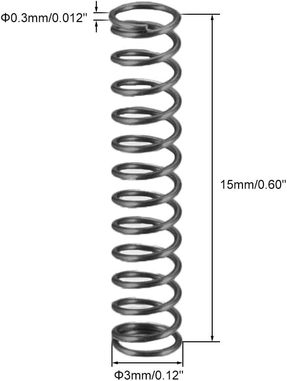 Precise Dimensions: With a wire diameter of 0.3mm/0.012"; Outer Diameter: 3mm/0.12"(OD); Free Length:15mm/0.60", this spring offers precise measurements, allowing for accurate installation and optimal functioning.