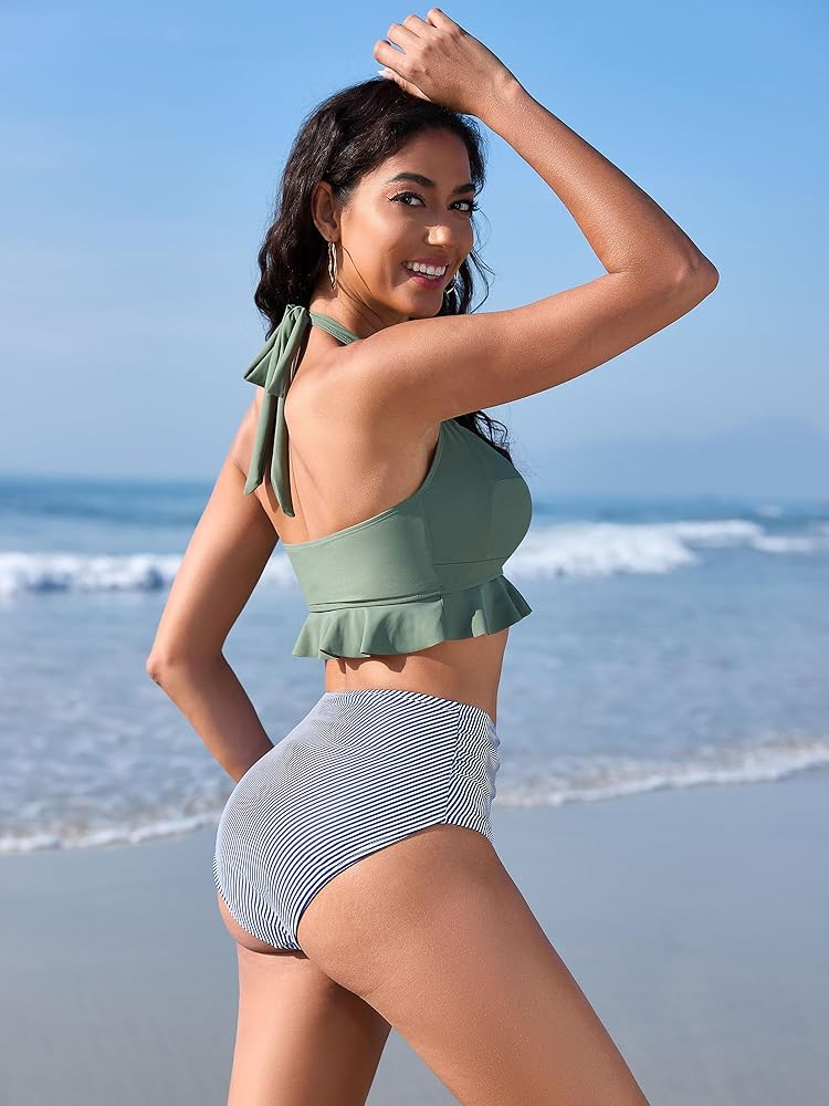 Retro halter swimsuits for women, features twist front design, flattering your charming and sexy body shape, classical ruffle flounce creating a vintage and elegant look.