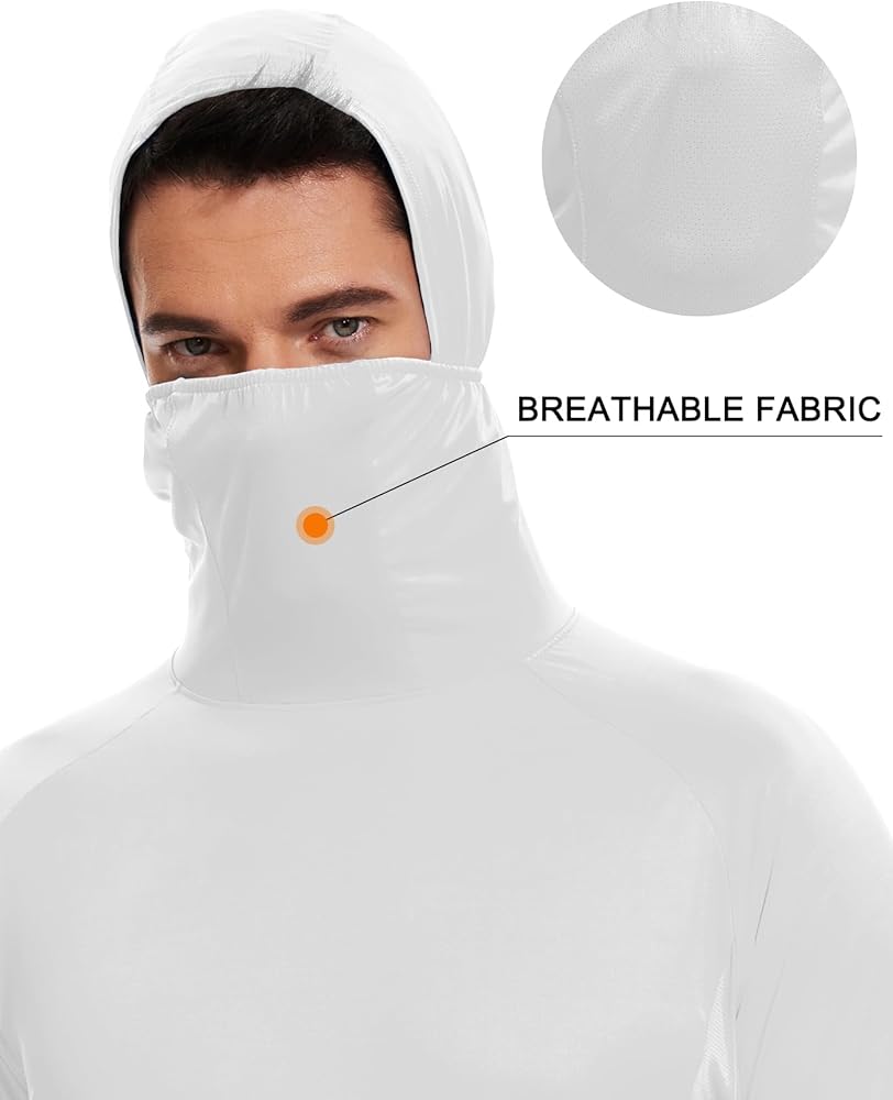 Hood and Neck Gaiter: Men's rash guard shirts features face mask cover. It is soft and breathable, enhanced with mesh breathing holes to help keep your sunglasses clear without fogging up.