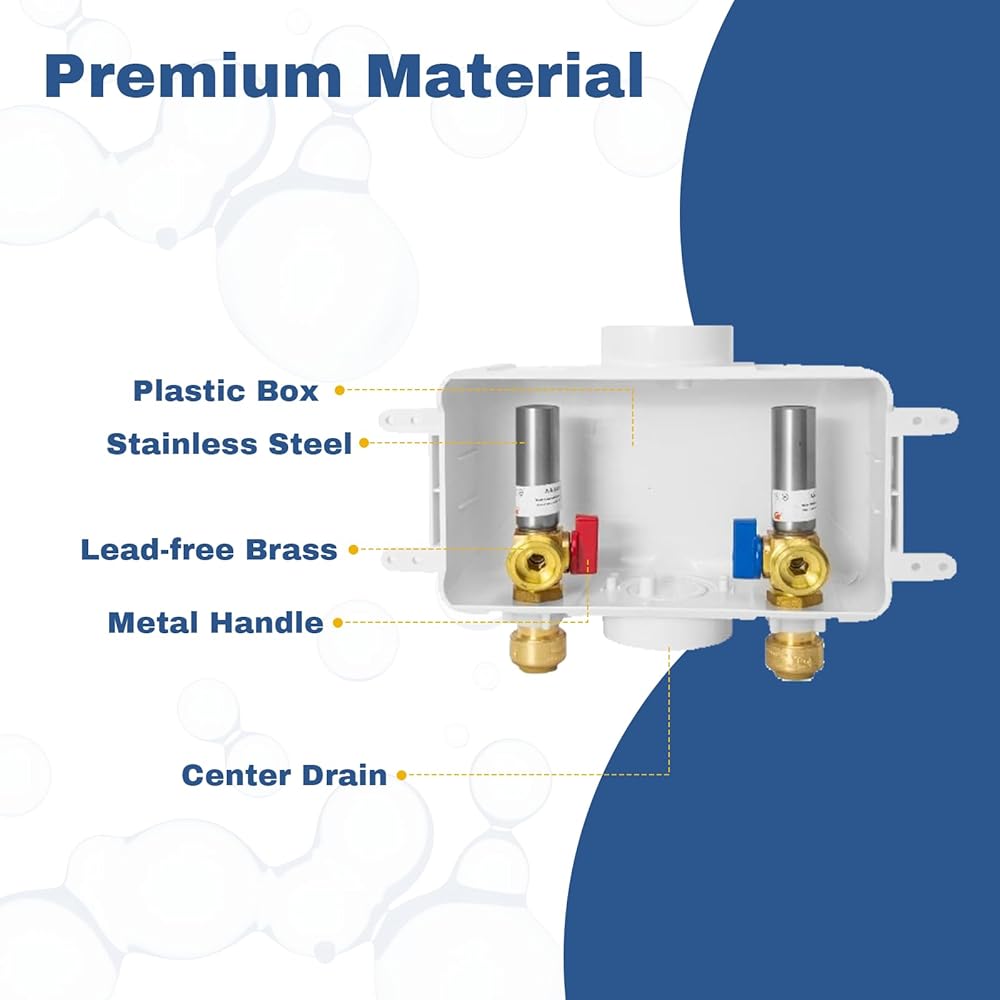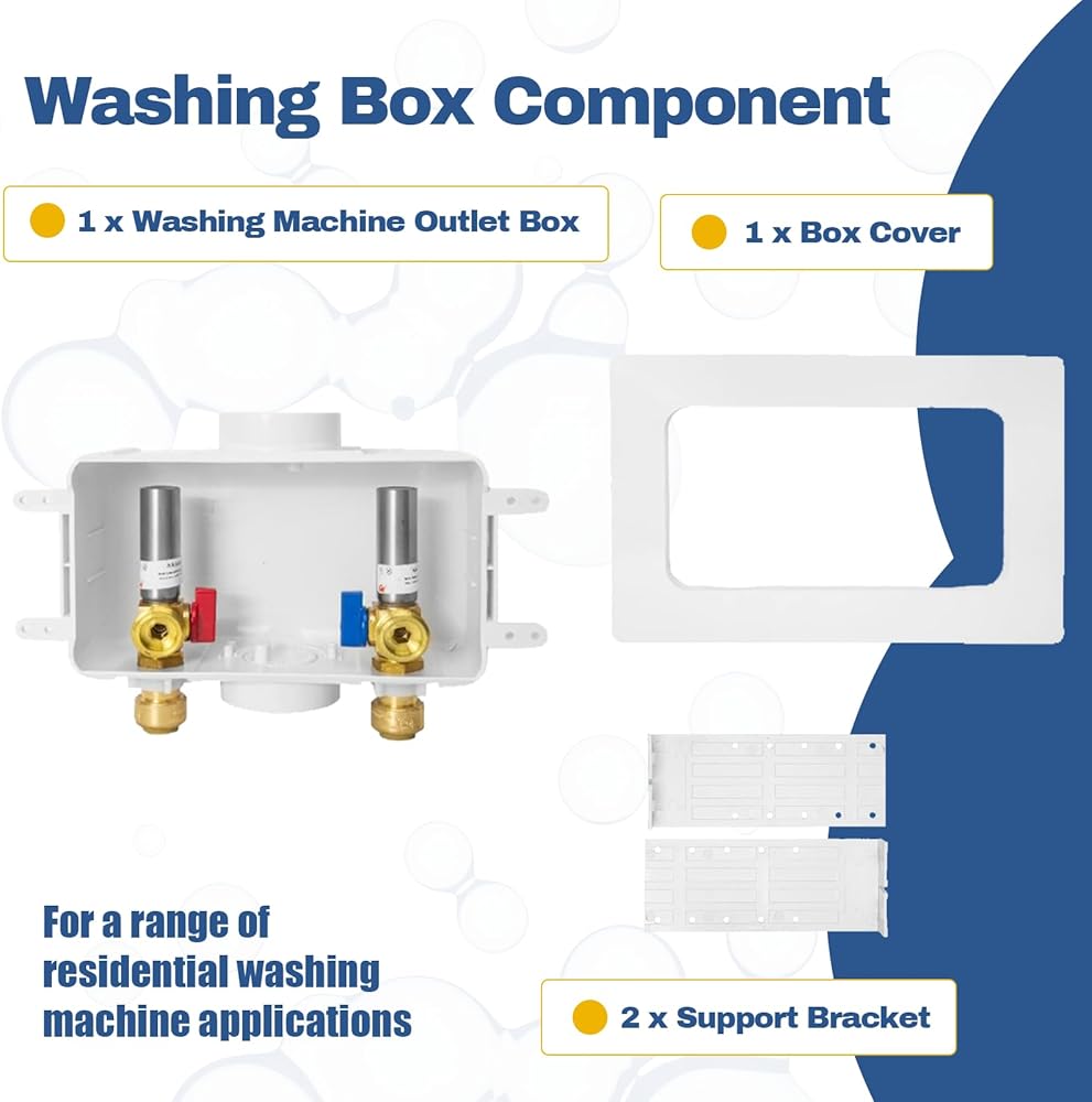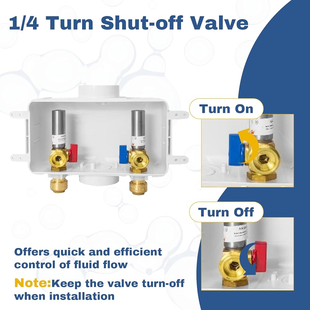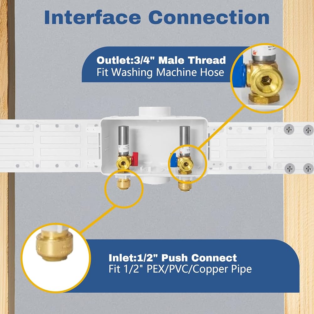 نوع الاتصال: يعمل الجانب المدخل من مربع الغسيل مع 1/2 "PEX/PVC/Copper Pipe ، وجانب المخرج يناسب خرطوم الغسالة 3/4"