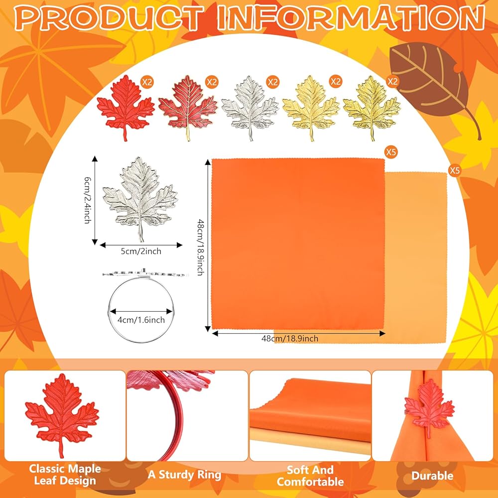 • Fall Fedable و Thanksgiving Fedicking Rings: سوف تتلقى 10 قطع من المناديل الخريف و 10 قطع من حلقات منديل ورقة القيقب. حجم مناديل قماش عيد الشكر هو 19*19 بوصة. يبلغ قطر حلقات منديل الخريف حوالي 1.57 بوصة وهو مناسب لتناسب معظم المناديل الخريف. يمكن أن تلبي الكمية الكافية احتياجاتك المختلفة. سواء كان عشاءًا عائليًا أو احتفالًا بالعطلات أو تقديم هدايا