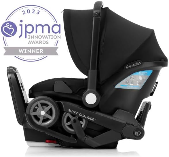 Car seat & stroller & carrier & life-changer in one! The Evenflo® Shyft™ DualRide™ Infant Car Seat Stroller Combo is a single piece of baby gear that Shyfts from infant car seat to stroller in one step. Moving from car to sidewalk? Lift carrier off the base, release the wheels and roll on. Maneuvering stairs? Retract the wheels, carry up or down steps, pop the wheels back down and go. Designed for infants 3 lb to 35 lb (15.7 in. to 32 in.), Shyft DualRide features a no-rethread harness that adjusts to 8 positions to grow with your child. Thoughtful design places the infant carrier on the stroller higher, so your baby is near. Integrated SensorSafe™ technology adds a layer of protection, while LockStrong™ Installation and Quick Connectors™ provide solid, secure installation in no time. Compatible with the Evenflo® Gold Shyft™ Travel System, this combo has a full-coverage canopy to block rain and snow, plus UPF 50+ to help block the sun. A sophisticated silhouette, washable padding and attention to quality ensure you'll Shyft into parenthood in style. It's the one piece of baby gear that does it all! At Evenflo, we go above and beyond government standards to create car seats that are safe. The Shyft DualRide is rollover tested and temperature tested. If you need help installing your car seat, our ParentLink® Consumer Care Team offers help online in real time. Get live video support with a certified car seat safety technician to assist with proper vehicle installation, so you can drive with confidence. Families have trusted Evenflo for more than 100 years for smart, innovative gear designed to make life easier, safer and more comfortable at home and on the go. Let us help you save time and find peace of mind, so you can focus on what matters most: your child.