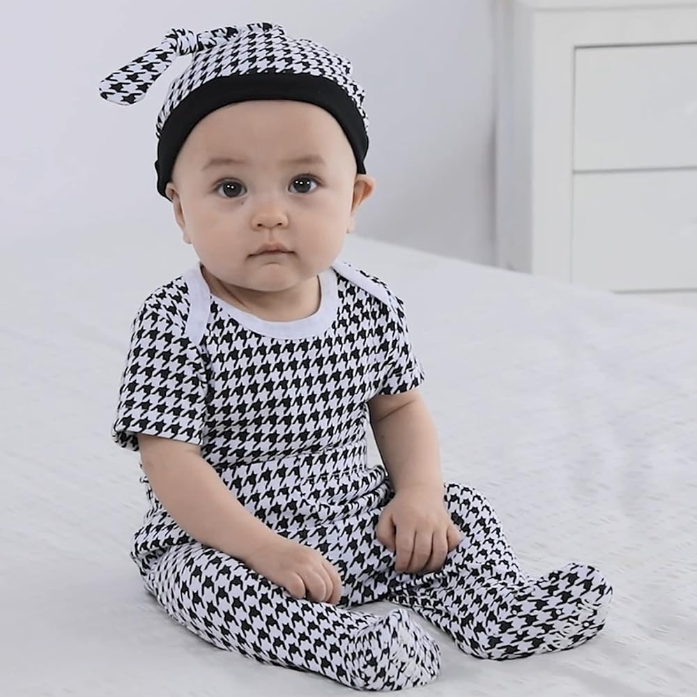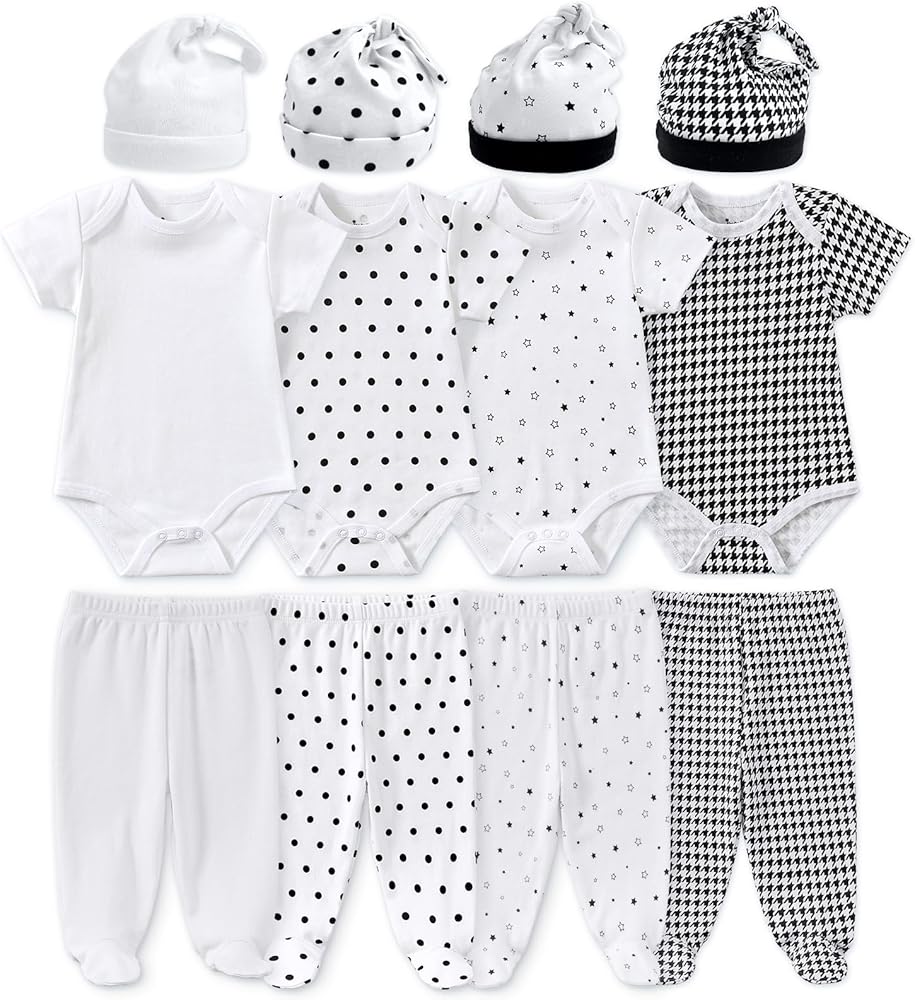 تحتوي مجموعة Layette على 4 قطع من Oneies و 4 قطع من السراويل ذات القدمين و 4 قبعات. تحتوي الأحكام على أطواق قابلة للتوسيع وتستقر على الساقين لتغييرات سهولة في ارتداء الملابس والحفاضات.