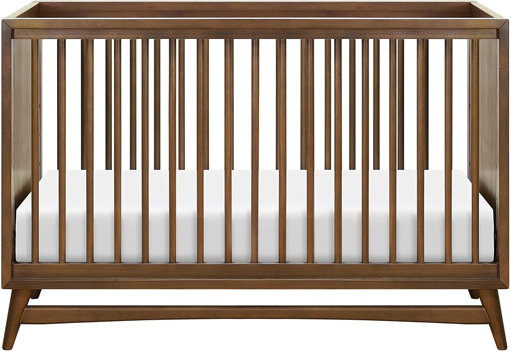 REFINED MID-CENTURY MODERN STYLE: Featuring a modern, clean silhouette and classic rounded spindles. Flared tapered legs add a playful touch to this sophisticated crib. Complete your nursery with the babyletto Palma 7-drawer dresser.