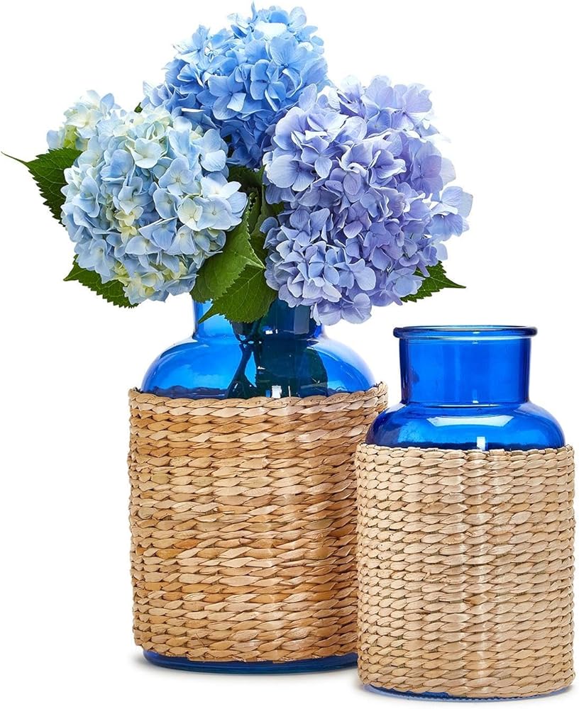 • Crafted with care, the blue glass exterior complements the intricate rattan wrap, creating a harmonious blend of textures that's sure to captivate. Whether you're looking to create a soothing ambiance with candles or display your favorite blooms, this set offers the perfect solution.