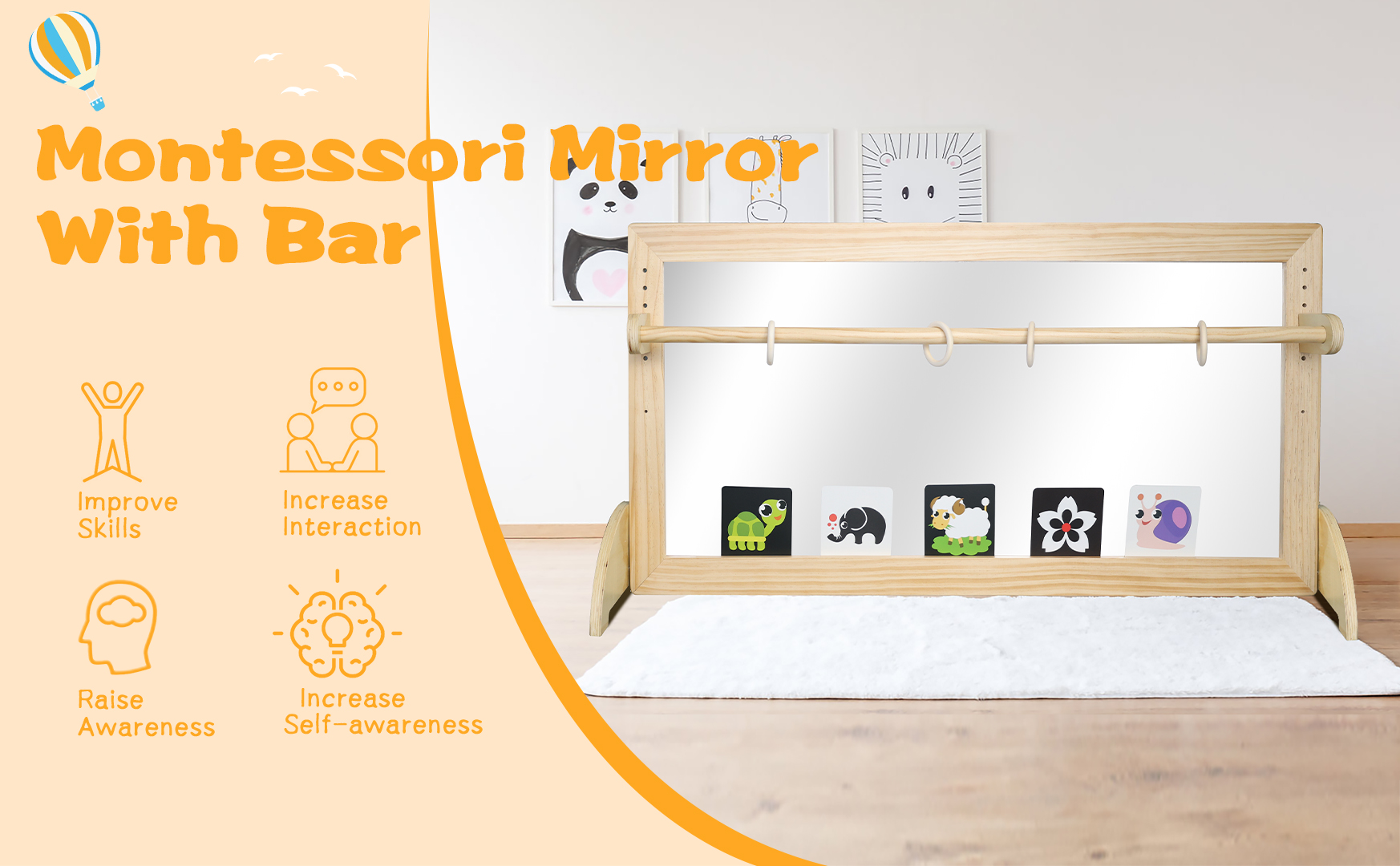 زيادة التفاعل: تم تجهيز مرآة مونتيسوري بـ 4 حلقات و 20 بطاقة ملونة ، وعناصر تفاعلية تسمح للأطفال بالانخراط في أنشطة إدراكية وعملية أخرى أثناء استخدام المرآة.