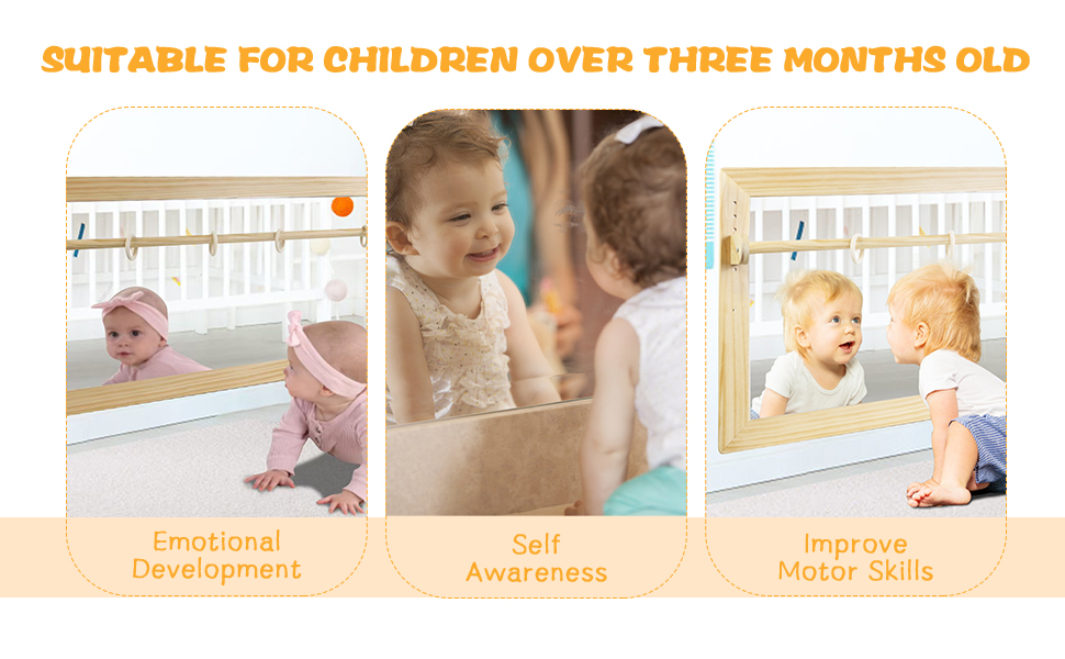 تطوير الوعي الذاتي: مرآة طفلنا مناسبة للأطفال الذين تزيد أعمارهم عن 6 أشهر. حوالي 6 أشهر ، يبدأ الأطفال في أن يصبحوا مهتمين بتأملاتهم الخاصة ، وبحلول سن 1 ، يتفاعلون بشكل أكثر نشاطًا مع الصور في المرآة. تؤكد فلسفة مونتيسوري للتعليم على تعزيز التعلم من خلال التجربة الحسية ، لذلك لا تسمح المرايا المناسبة للأطفال فقط بمراقبة أنفسهم ، ولكنها تشجعهم أيضًا على أداء الحركات والتعبيرات المختلفة.