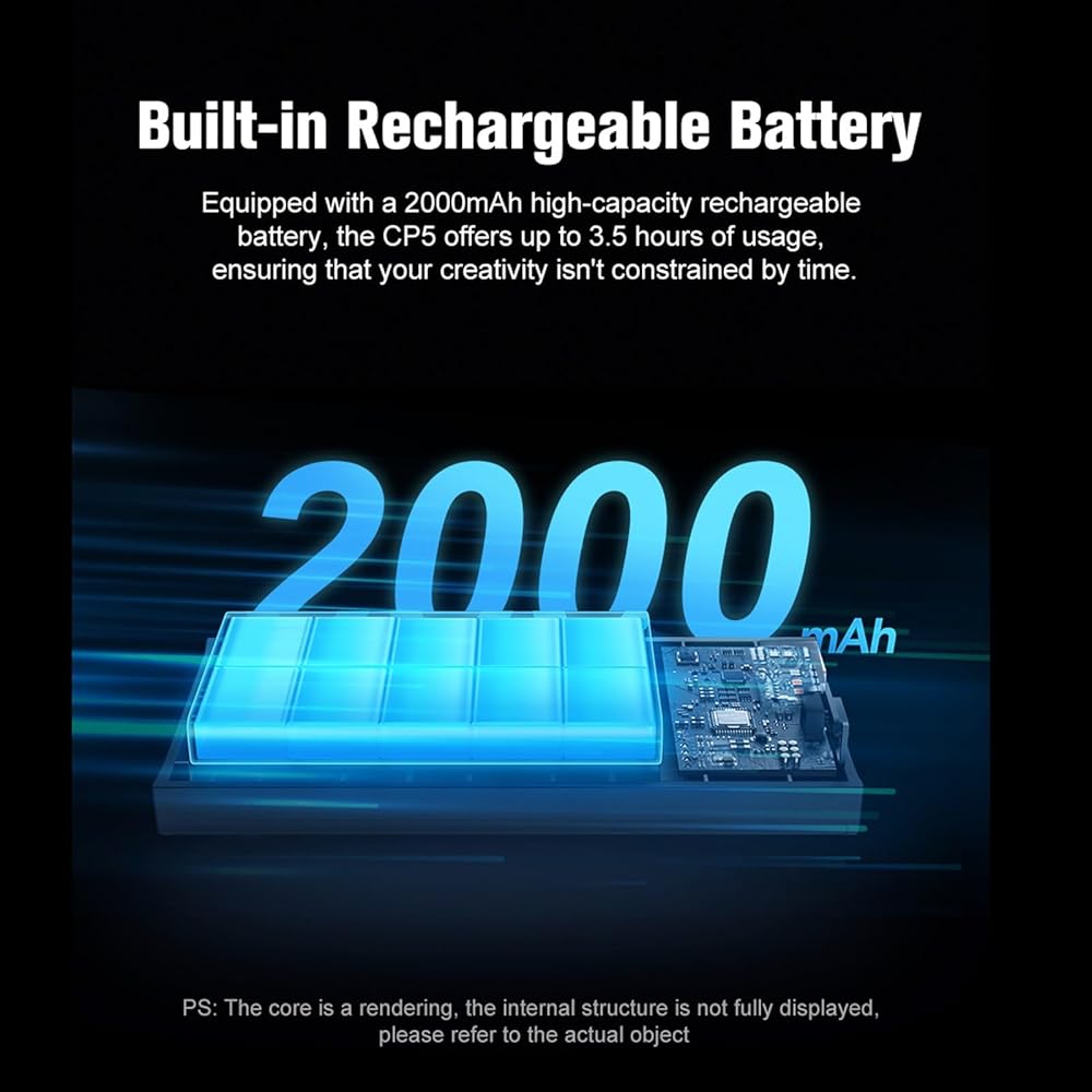 مزودًا ببطارية قابلة للشحن عالية السعة 2000 مللي أمبير في الساعة ، يوفر CP5 ما يصل إلى 3.5 ساعات من الاستخدام ، وبالتالي فإن إبداعك لن يقتصر على الوقت