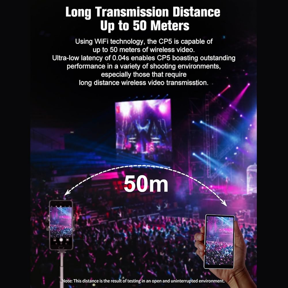 باستخدام WiFi ، يمكن لـ CP5 نقل الفيديو اللاسلكي يصل إلى 50 مترًا. مع زمن انتقال منخفض للغاية قدره 0.04s ، يكون له أداء رائع في بيئات التصوير المختلفة ، وخاصة أولئك الذين يحتاجون إلى نقل الفيديو اللاسلكي لمسافات طويلة