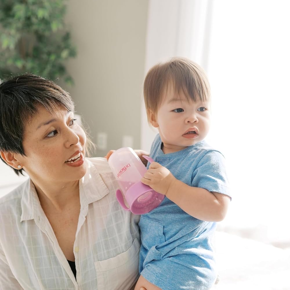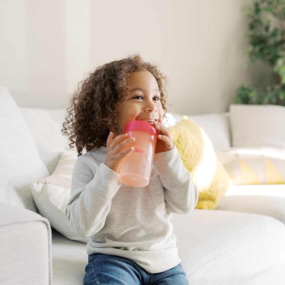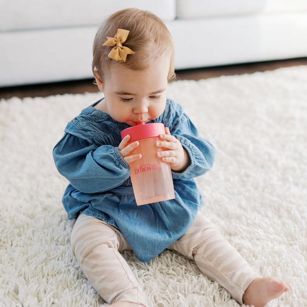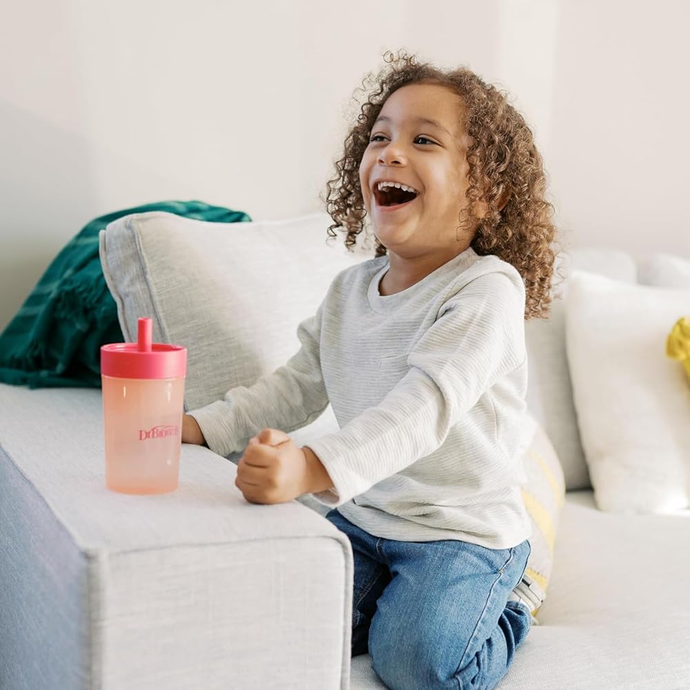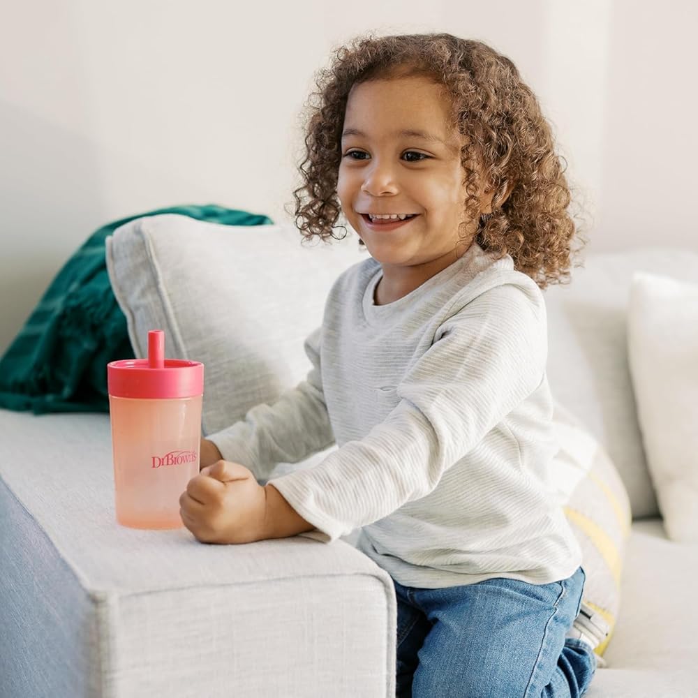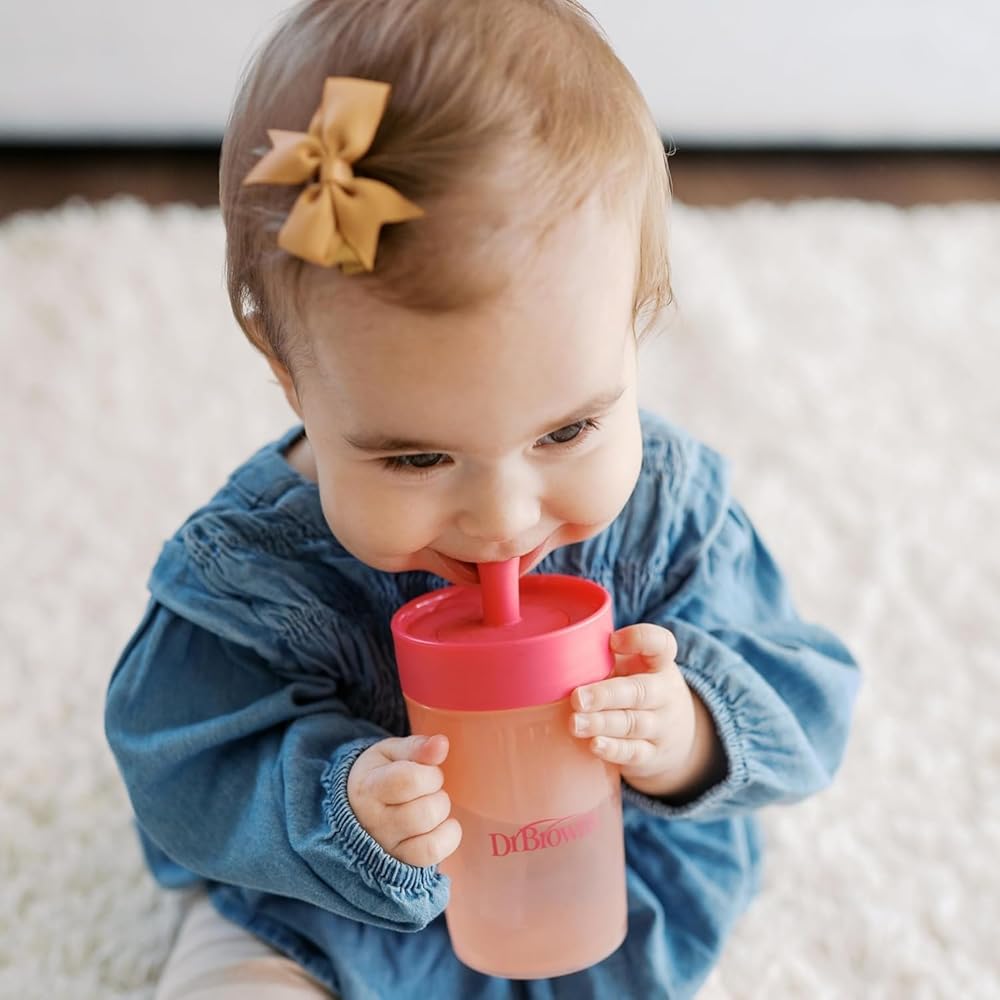 The all-in-one set to help baby transition to straw and big kid sipping. Dr. Brown's Straw to 360° Cup Set includes a lid with super soft silicone straw to help baby develop new straw-sipping skills. The silicone is gentle on baby's sensitive mouth and is spill-proof! Then when baby is ready, switch to the Cheers 360 sippy cup lid. The 360-degree design lets baby drink from any edge, and the Sip and See clear silicone valve lets baby see inside without spilling for true leak-free learning. The Cheers 360 lid features handles that are easy for little hands to grasp and tilt while developing independent drinking skills. The cup is translucent so you can see when it's time for a refill, and the easy to assemble three-piece design is dishwasher (top rack) and sterilizer safe for easy cleaning.