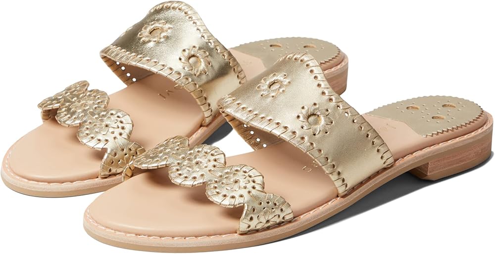A bright and vibrant design encapsulates the look of the Jack Rogers Caroline Flat Sandals. This footwear pairs well with all kinds of outfits. Leather upper. Leather lining and insole. Slip-on style. Signature brand detailing on the insole. Synthetic outsole. Weight: 9 oz.