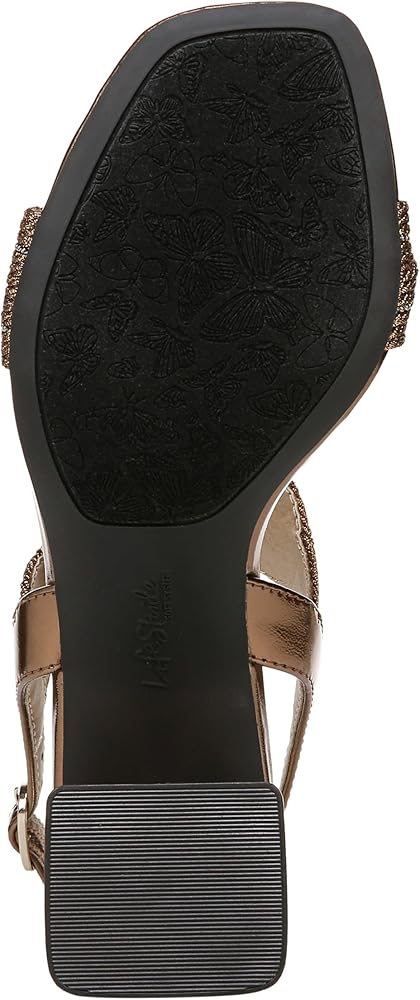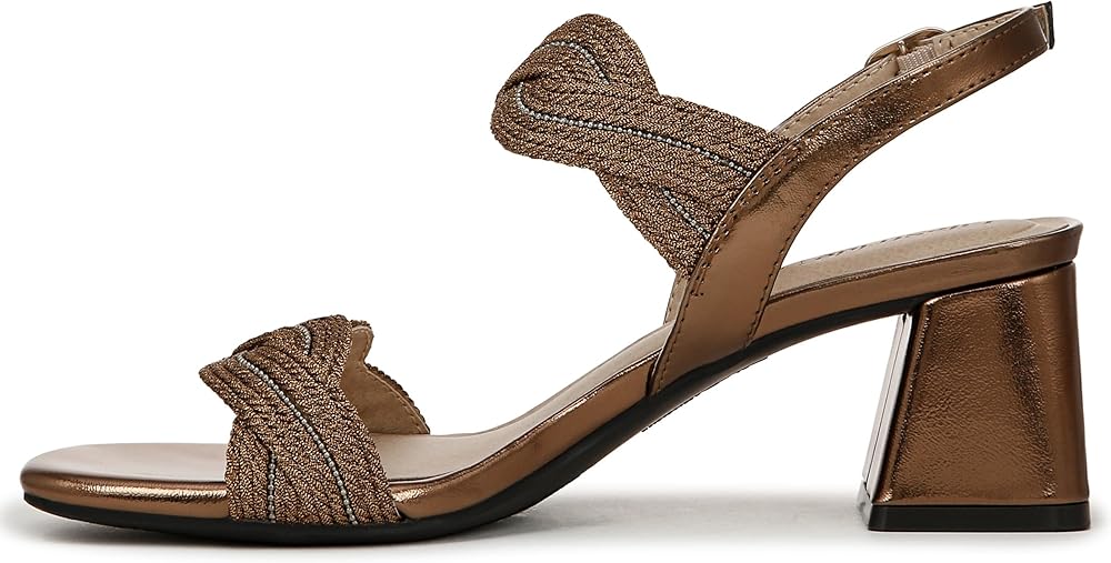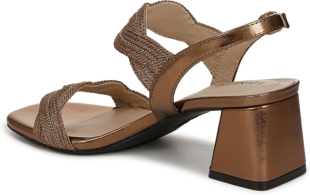 Shine with every step in these stunning women's block heels with rhinestone accents. Slingback heels designed with faux leather, an open square toe, heel slingback strap with adjustable buckle for the perfect fit, built-in stretch, and rhinestone accents. Linings crafted from partially recycled materials. Trusted Soft System® comfort technology for unmatched cushion, support, and flexibility in every pair. Enhanced flexibility with an ultra-flexible, padded platform heel for easy movement. Traction sole for extra stability. Just Right Height 2 1/8 inch angled block heel.