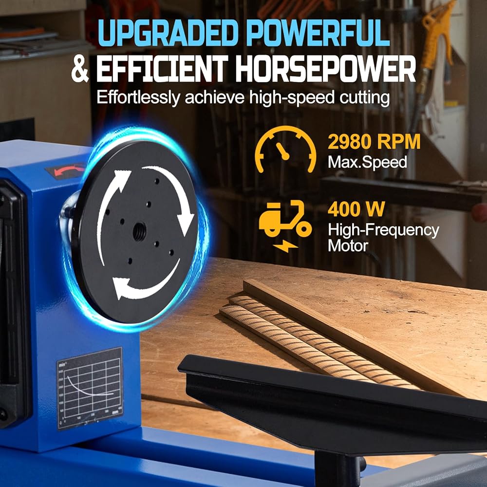 Powerful 400W Motor: This benchtop lathe is powered by a robust 400W motor, delivering exceptional performance for all your woodworking projects. Experience smooth operation and low noise thanks to its soft start function, which enhances safety and efficiency as you work