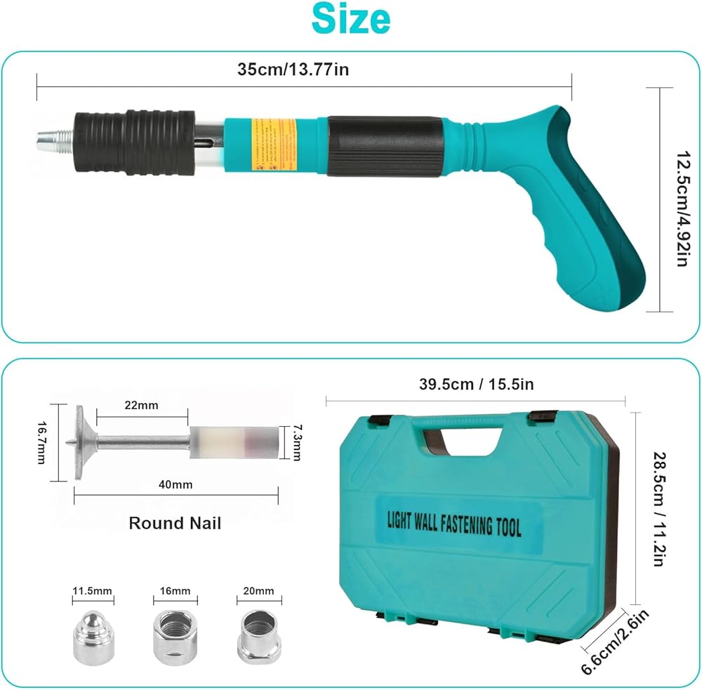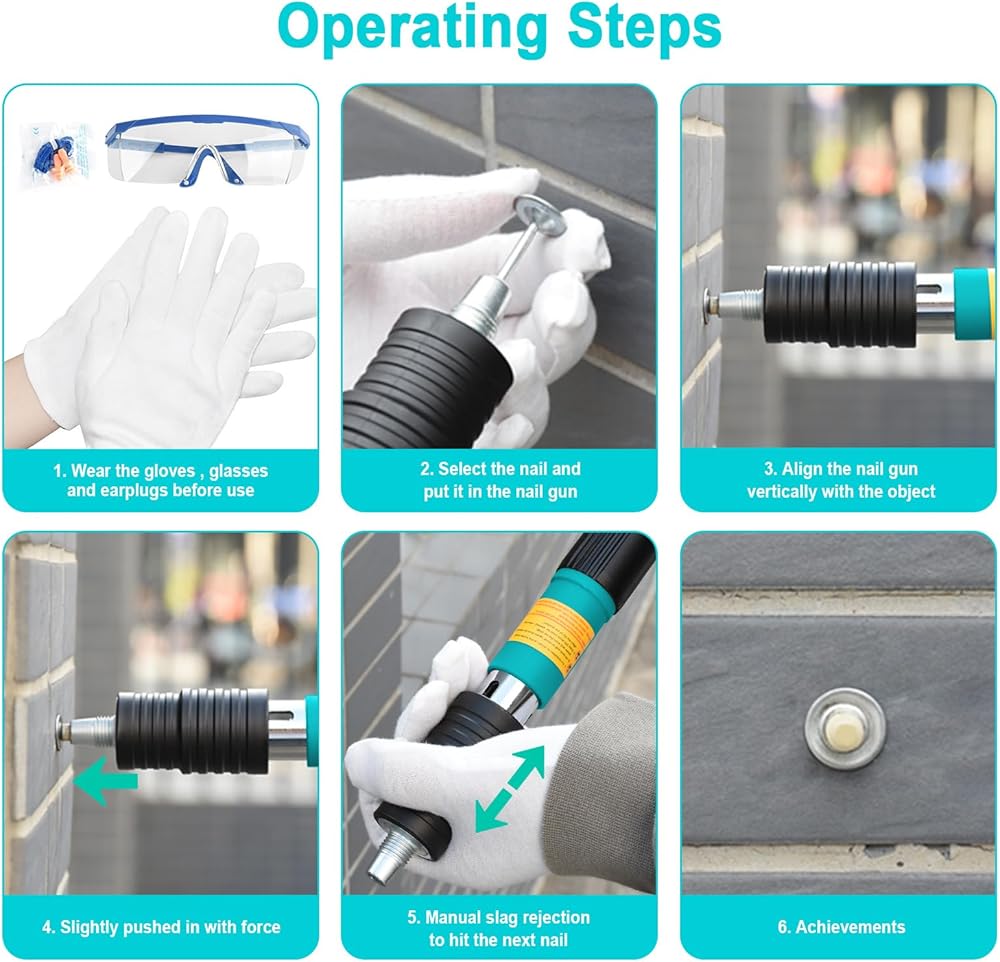 سهل التشغيل: خمس خطوات للاستخدام ؛ 1 ارتداء نظارات واقية ، قفازات ، سدادات الأذن ؛ 2 اختر الظفر ؛ 3 مسدس الأظافر رأسياً في مكان العمل على استعداد لإطلاق النار ؛ 4 قوة عمودية في الحائط. 5 احصل على غلاف كاتم الصوت باليد ، والضغط الخلفي عدة مرات للانسحاب