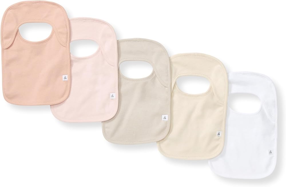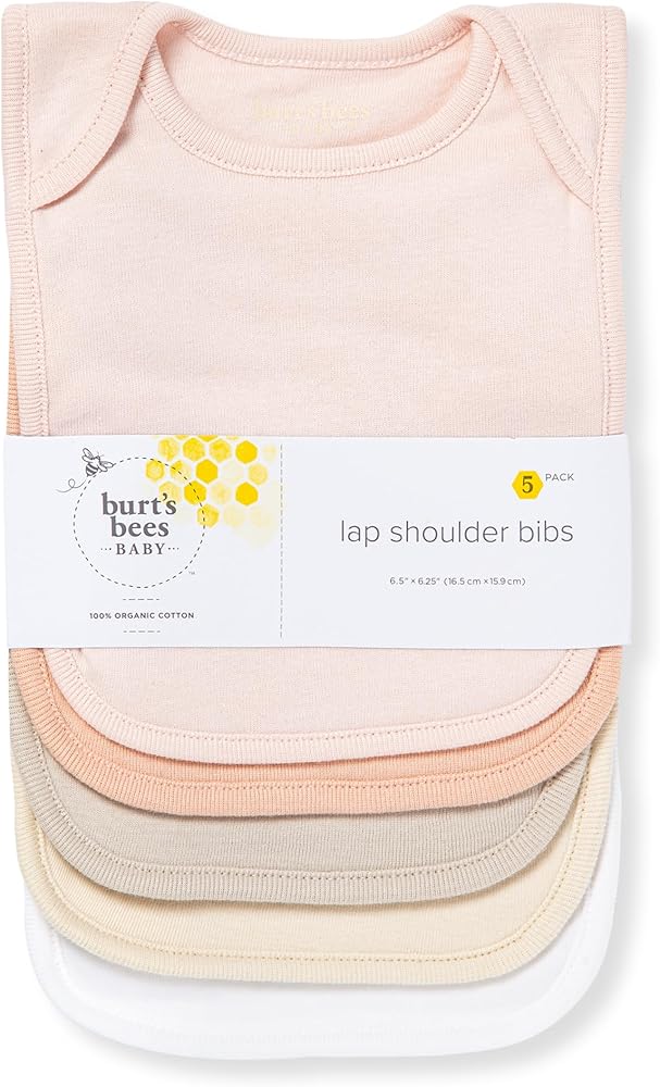 Keep your little bee clean with Burt's Bees Baby Infant Bibs. Made from 100% organic cotton, our bibs are ultra soft and durable. These hassle-free, snap-and velcro-free bibs ensure a soft and comfortable feel against your baby's sensitive skin. The 2-ply fabric with a terry towel backing offers superior absorbency, keeping your little one dry and clean through meals and drool-heavy days. Our lap shoulder-style bibs easily stretch over your baby's head for a fuss-free experience. They feature exclusive hand-painted watercolor designs—they make a perfect baby shower gift and registry add on. These bibs are machine washable and retain their shape and softness wash after wash, designed for the realities of parenting. Each bib measures 8 x 7.5 inches, available in packs of 4 or 5, ensuring you always have a clean bib on hand. Choose Burt's Bees Baby bibs for practicality, aesthetic charm, and environmental responsibility, handling everything from drooling and teething to feeding times.