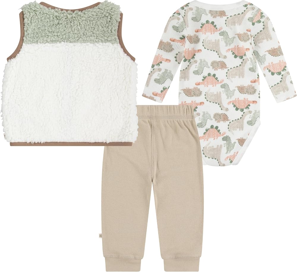 Hey, baby! This three piece set has an easy on bodysuit, joggers, and the coziest sherpa vest. Made of recycled polyester, this set will be soft and gentle on baby's skin all season long. Keep baby comfy and cozy in this sherpa vest, bodysuit and jogger set! Manufactured under license by The Haddad Apparel Group, Ltd. or its Affiliates