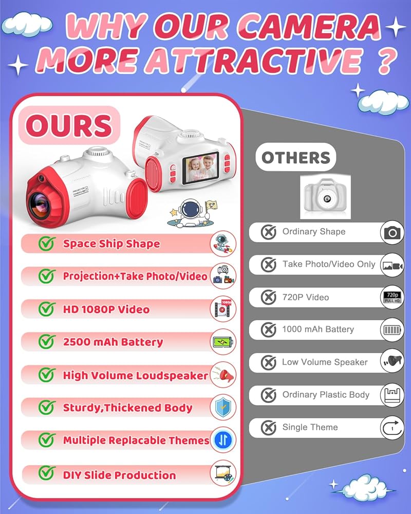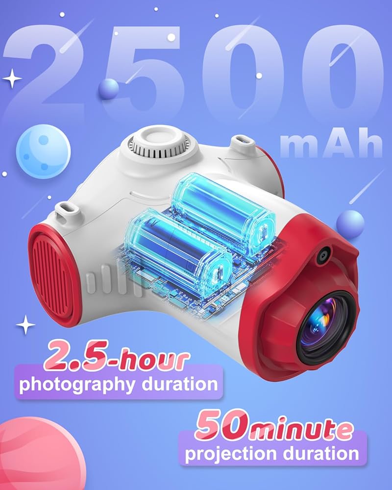 • لماذا نختارنا: مقارنة بكاميرات الأطفال الآخرين ، فإن الكاميرا على شكل سفينة الفضاء لدينا أكثر جاذبية وغنية بالميزات. تسمح مكبرات الصوت القوية المدمجة للاستماع إلى جهاز العرض بدون معدات صوتية إضافية. توفر بطارية كبيرة ما يصل إلى 50 دقيقة من الإسقاط و 2.5 ساعة من التصوير الفوتوغرافي