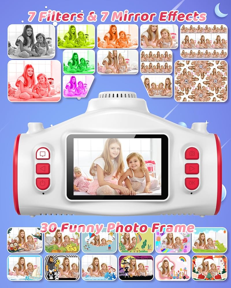 • الإطارات والمرشحات الفاخرة: مع المرشحات والأطر الفاخرة ، يمكن للأطفال التقاط لقطات ممتعة في الإرادة. اختر من بين أكثر من 30 إطارًا ومرشحات ، بما في ذلك تاج الأميرة ، وآذان الأرانب ، وأكثر من ذلك. هذه الميزات تثير اهتمامهم باستمرار وإبداعهم في المصورين الناشئين