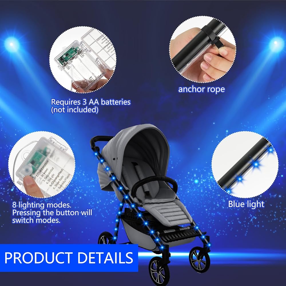 Multiple Lighting Modes: Featuring a soothing blue glow, the stroller lights create a calming ambiance for your baby. Use the button on the switch to toggle between multiple flashing modes to suit your needs.