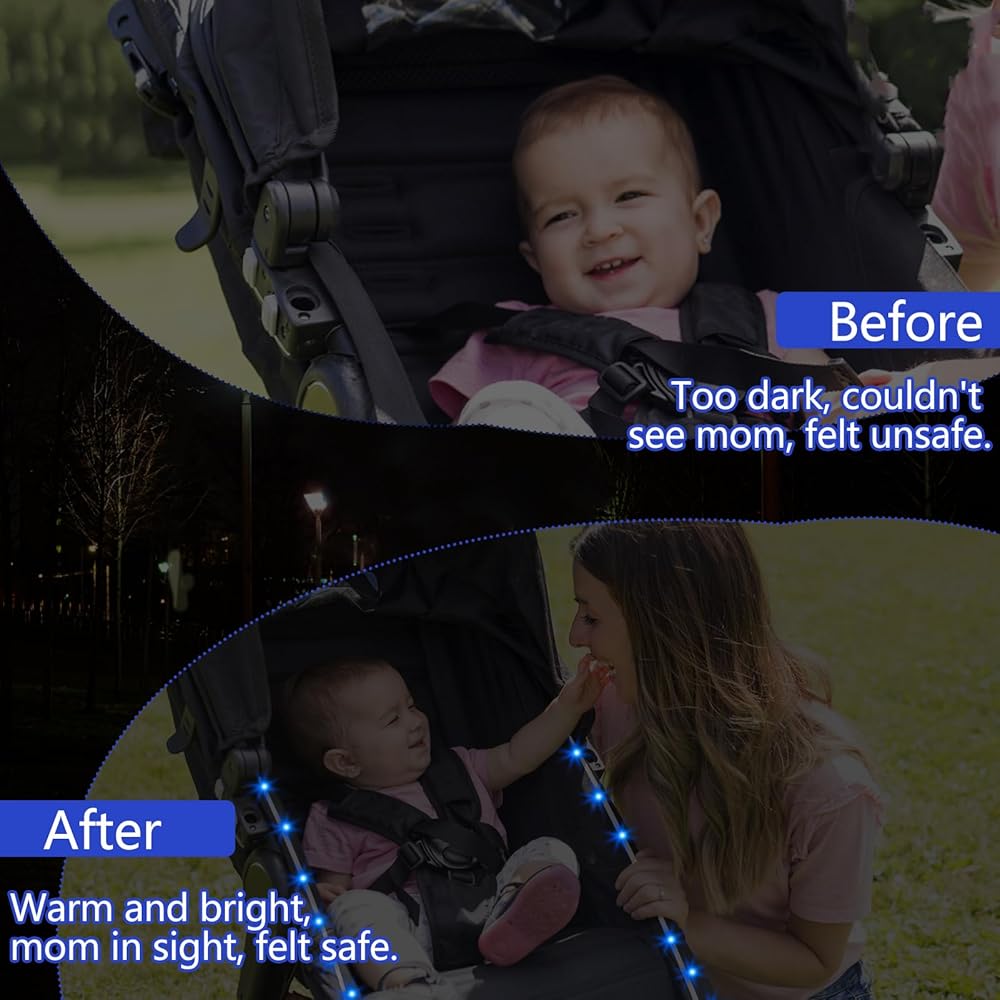 Versatile & Multi-Functional Design: Designed to provide visibility and safety for nighttime strolls, these light strings offer a sense of security for your baby in the dark. Additionally, baby car light can be used on bicycles, motorcycles, scooters, skateboards, boats, clothing, helmets, and more, adding fun and style to your outings.