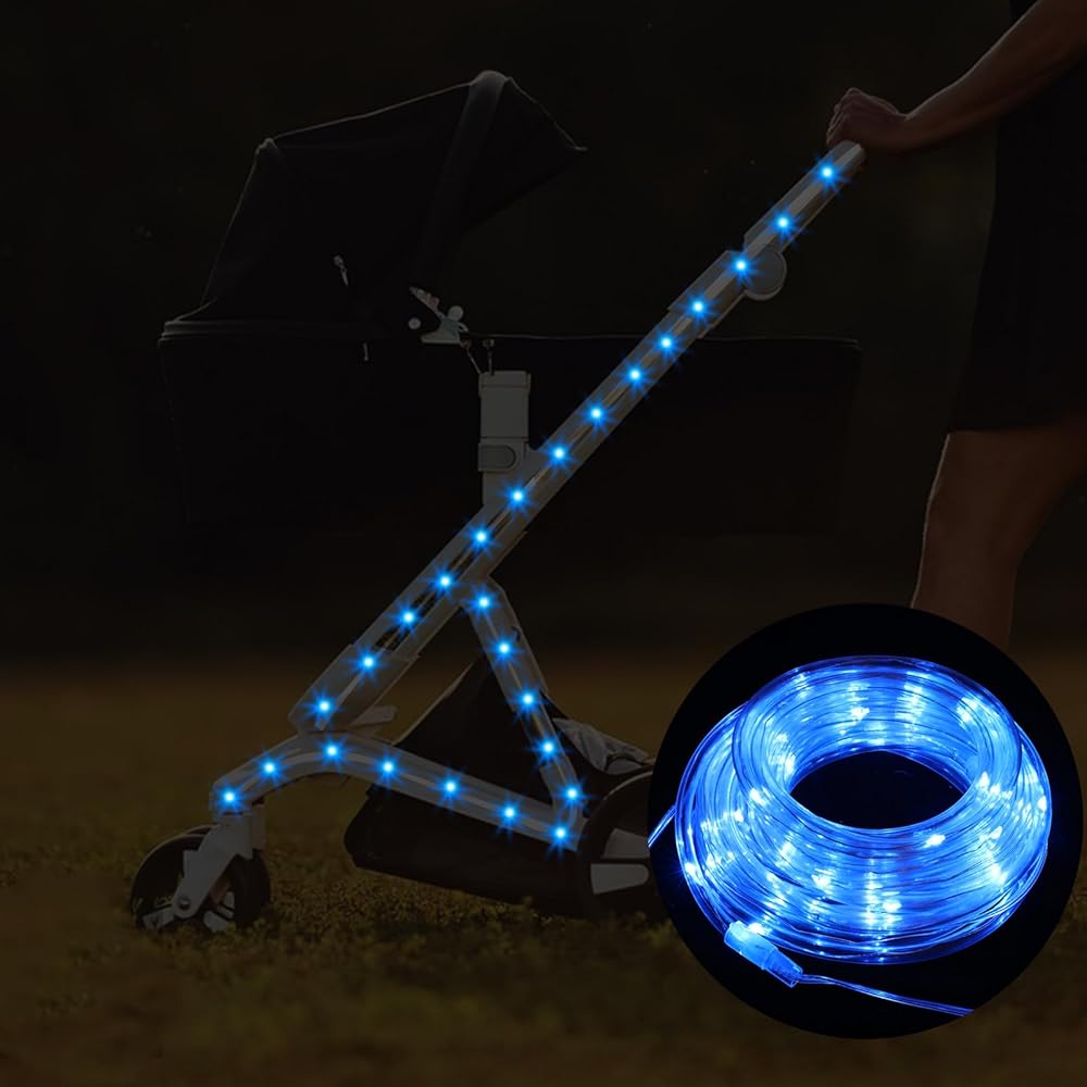 The 9.8FT baby stroller lights for walking at night enhance nighttime visibility for strollers, providing safety and fun during evening walks. Made from durable, waterproof materials, these lights feature multiple modes,and come with 30 cable ties for easy installation. They're battery-powered, ensuring long-lasting use without frequent replacements. Perfect for strollers, bikes, and more.